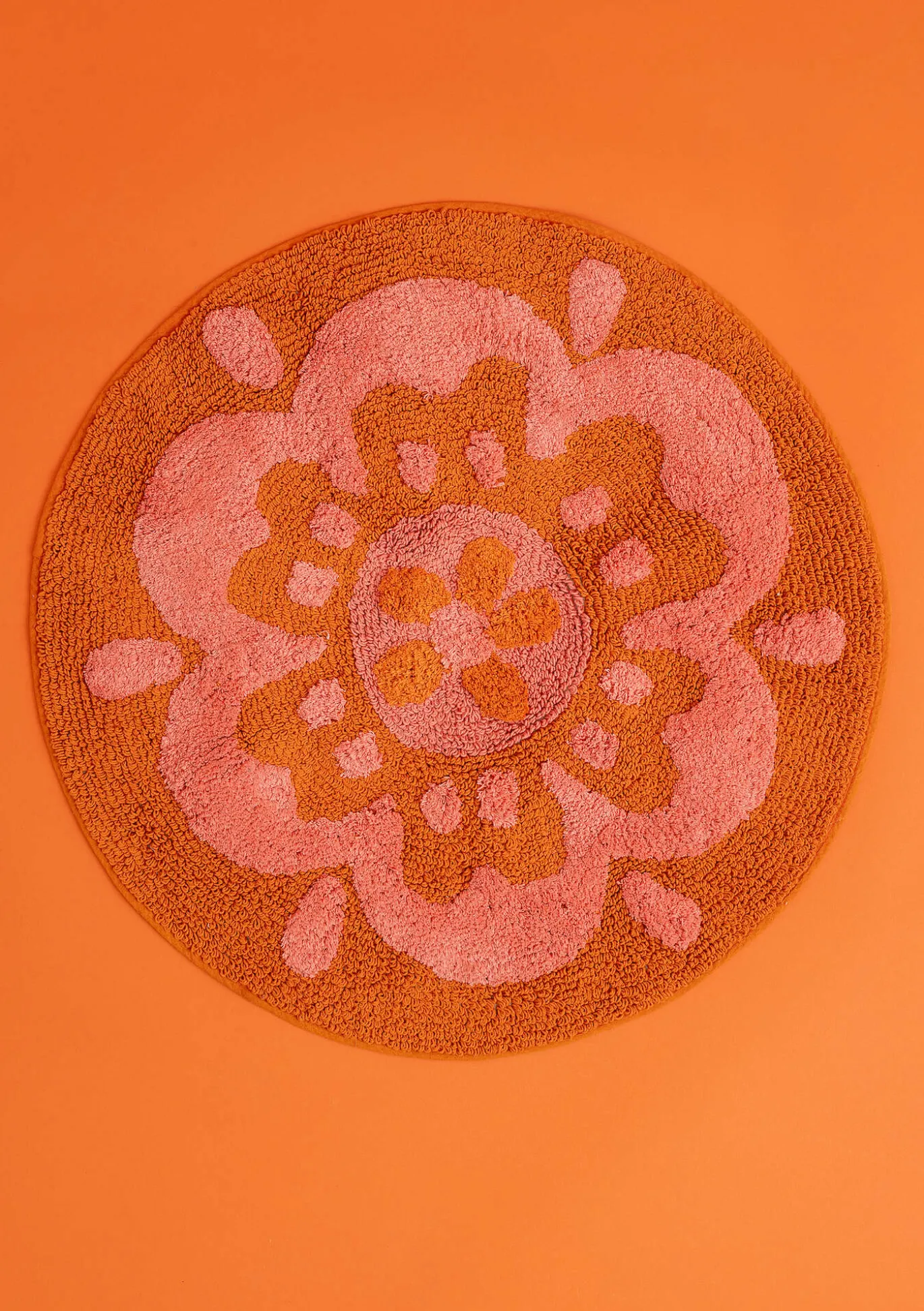 Runder Badteppich mit einer großen Blüte. Getuftetes Modell mit Schlingen und geschnittenem Flor. Rutschfeste Unterseite.