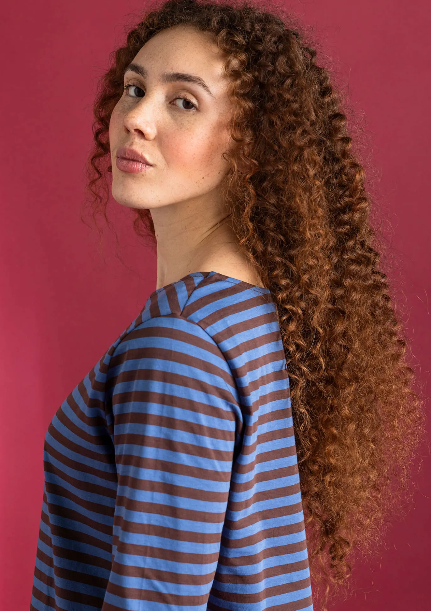 Schlichtes Langarmmodell mit garngefärbten Streifen. Angedeuteter U-Boot-Ausschnitt mit umlaufender Zweinadelnaht.