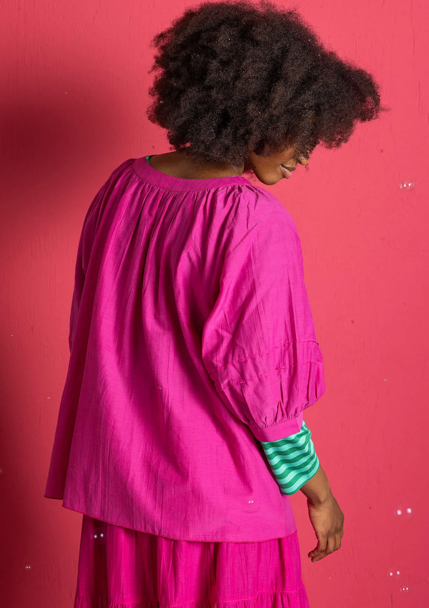 Pludrige Bluse mit großzügiger Weite. Runder Ausschnitt mit angekräuselter Blende. 3/4-Ärmel mit zwei Biesen und angekräuselten Abschlüssen.