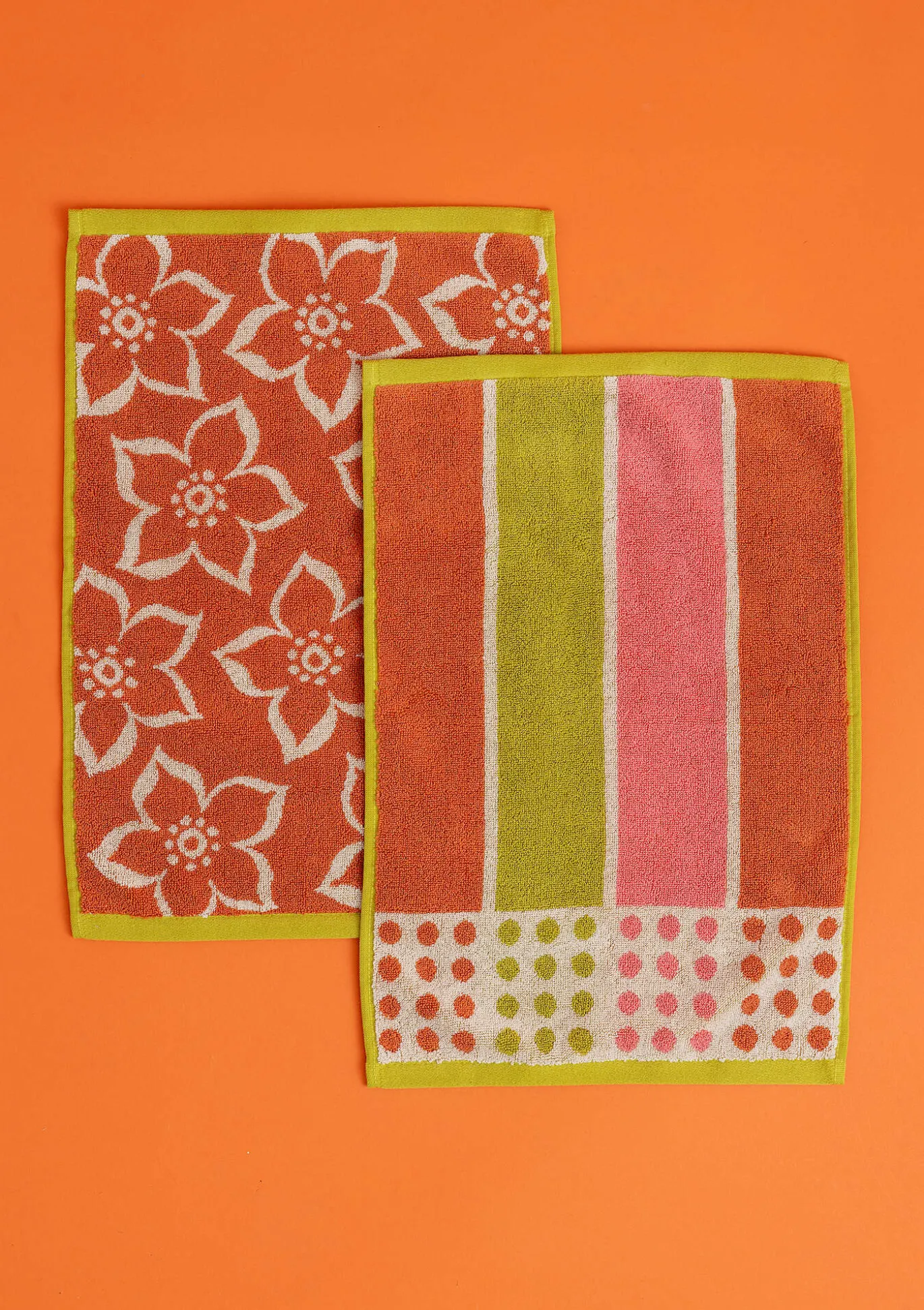 Zwei Gästehandtücher, das eine mit einem Blattdessin, das andere mit Streifenmuster. Kontrastierende Kanten und Aufhänger an der Stirnseite.