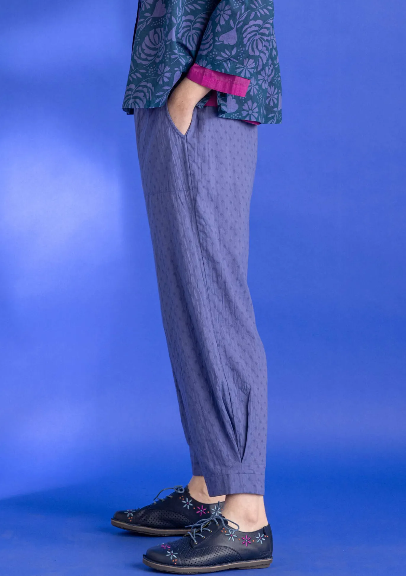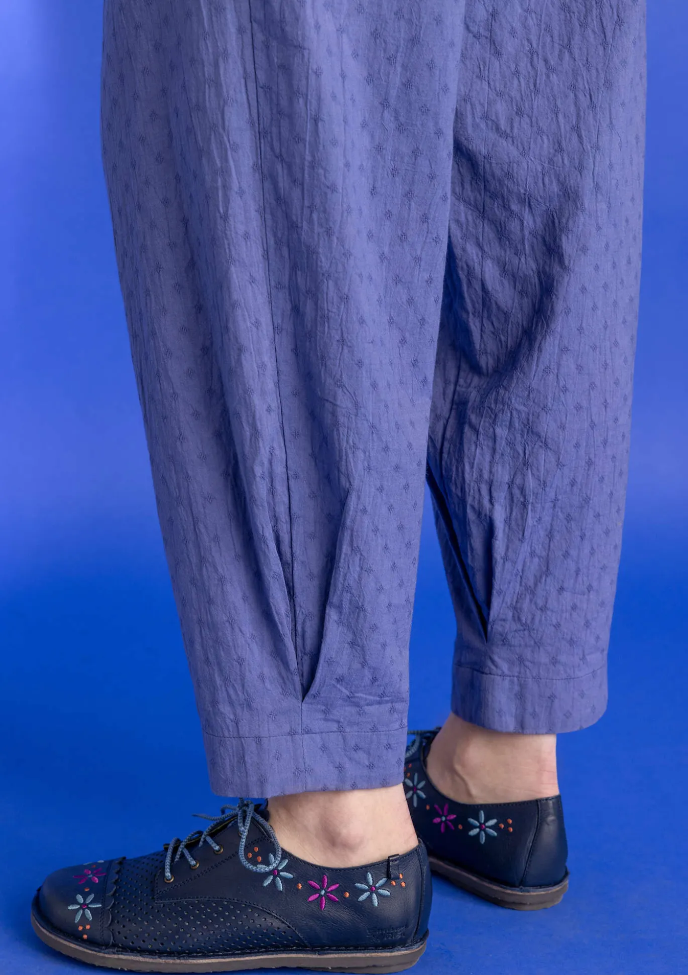 Knöchellange Hose. Einfarbiges Modell aus Dobby-Gewebe mit feinem Strukturmuster. Leicht pludrige Form dank Kellerfalten unten am Bein. Seitentaschen und bequemer Dehnbund.