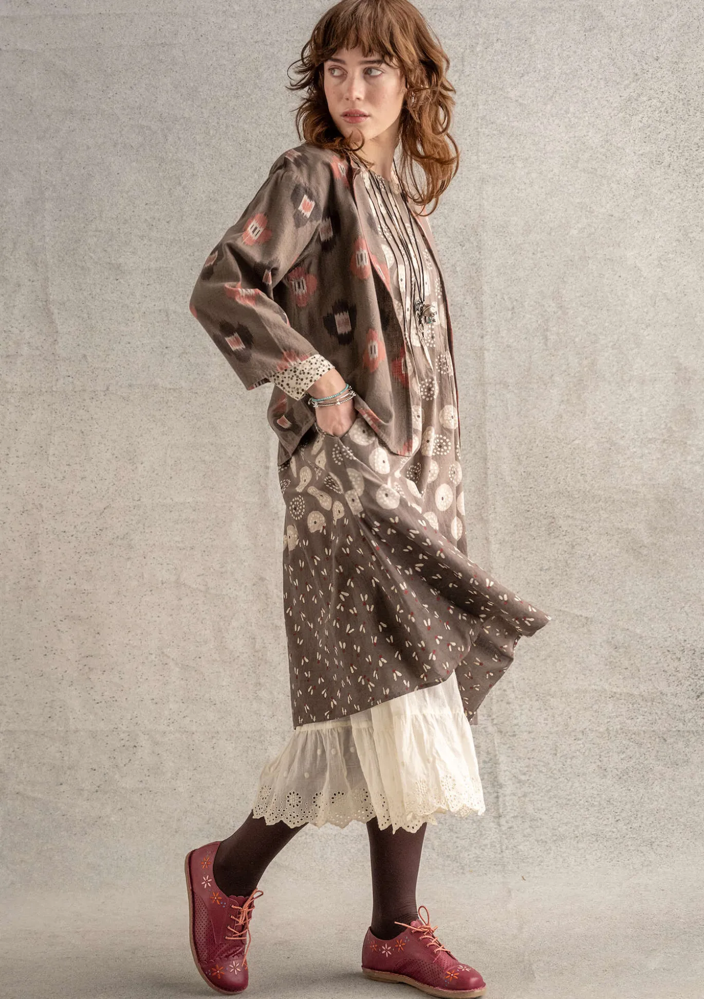 Jacke mit floralem Ikat-Webmuster. Leicht ausgestelltes Modell mit rundem Ausschnitt und 3/4-Ärmeln. Mit einem Stoffknopf zu schließen.