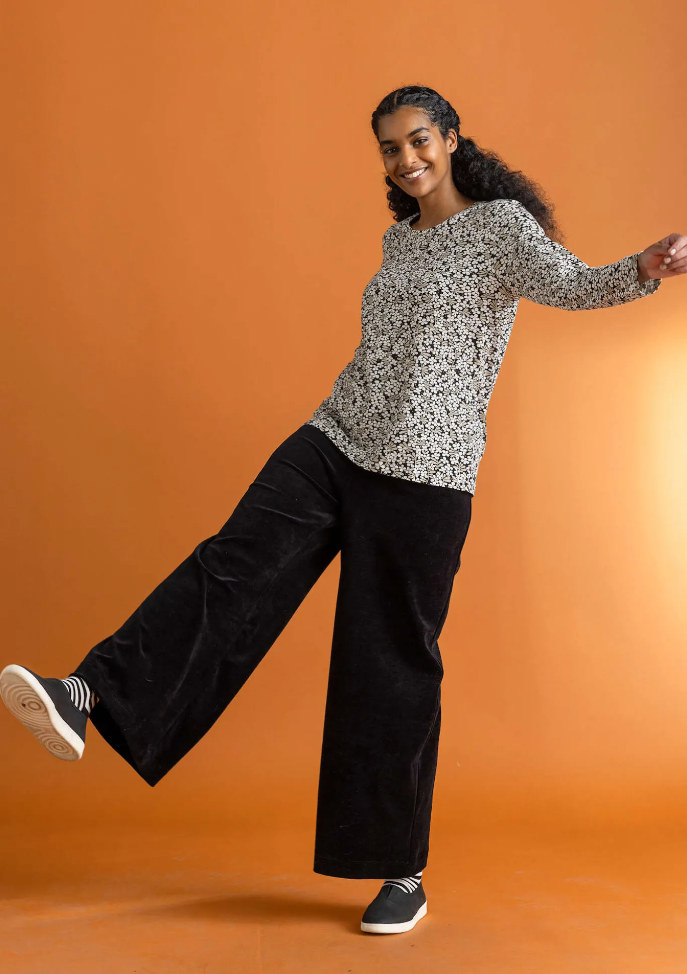 Vielseitiges Langarmmodell mit rundem Ausschnitt. Sowohl einfarbig als auch mit unserem kleinen Blumenprint „Ylva“ zu haben.