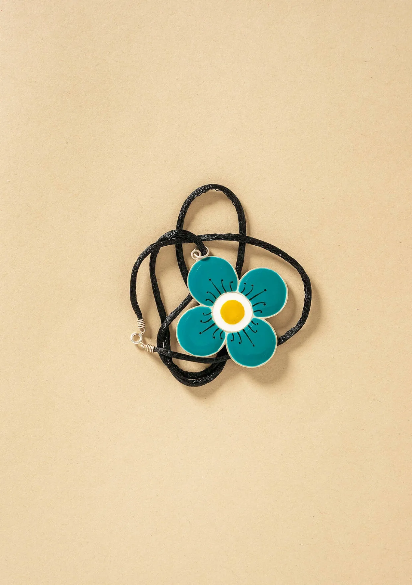 Exklusiver, hübsch emaillierter Kettenanhänger in Blütenform, aus 925er-Sterlingsilber. 62 cm lange Schnur mit Silberverschluss. Verpackt in einem kleinen Stoffbeutel.