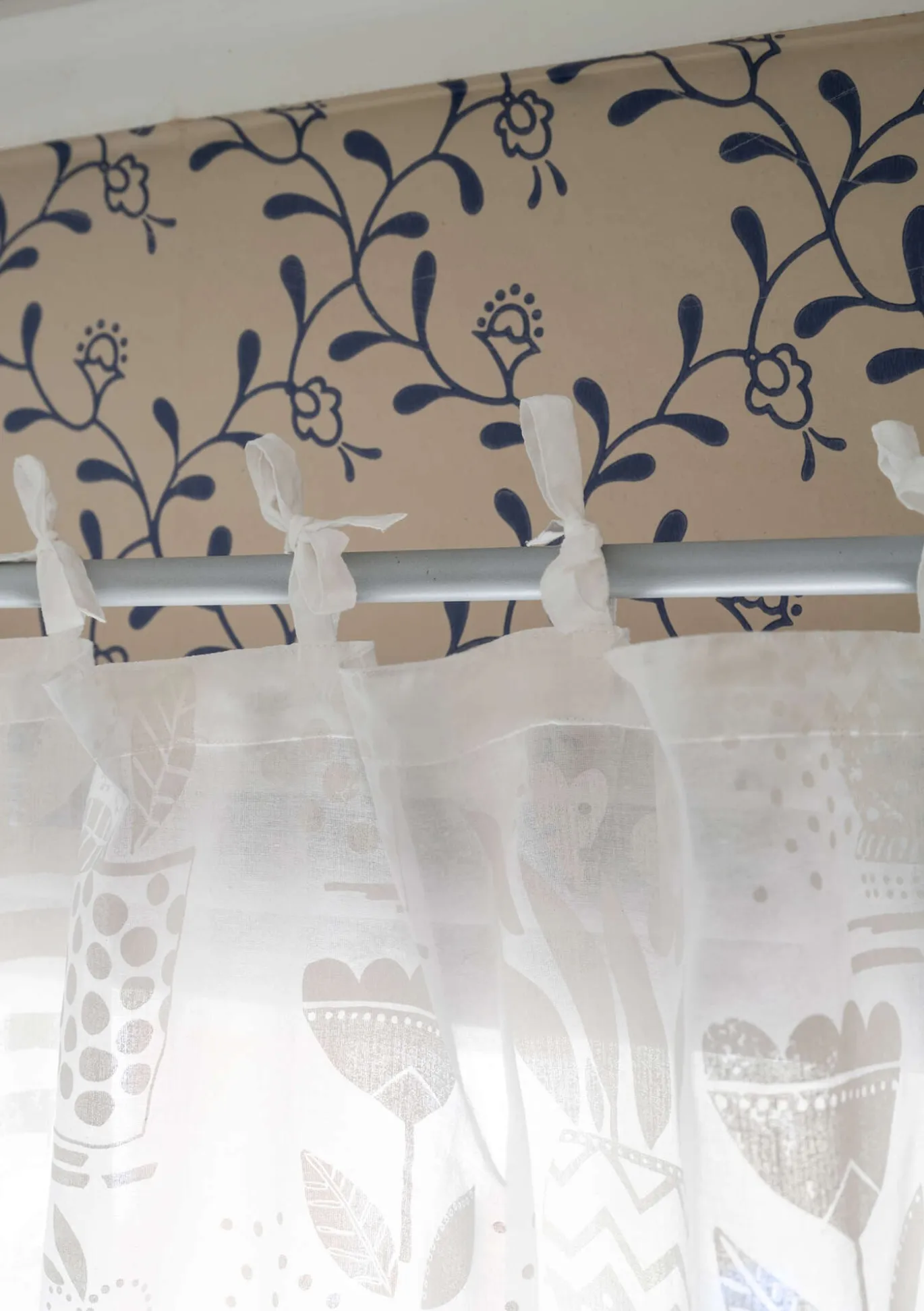 Kurze Gardine aus Bio-Baumwollvoile mit Musterdruck. Bindebänder zum Aufhängen an der Gardinenstange. Wird einzeln verkauft.