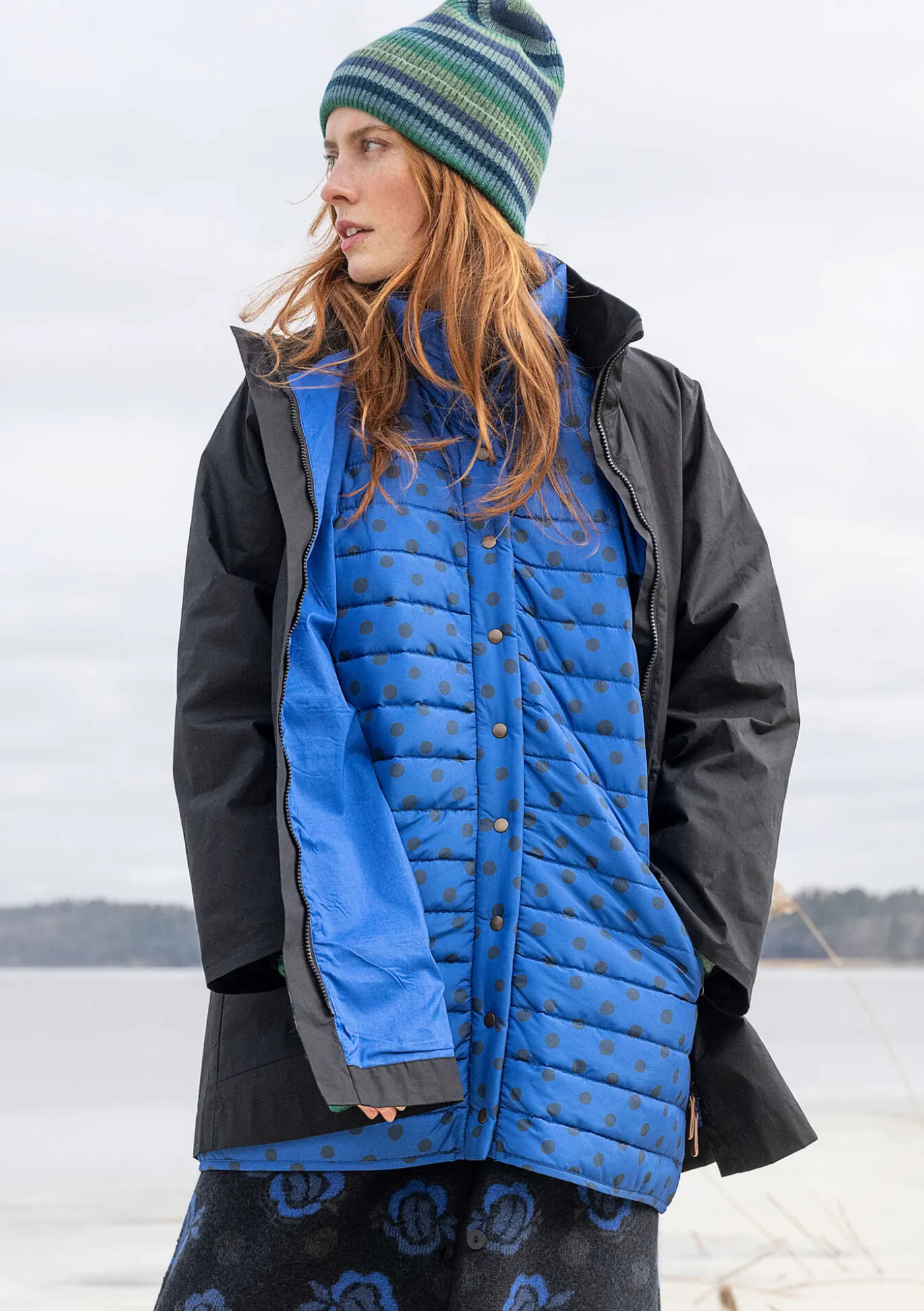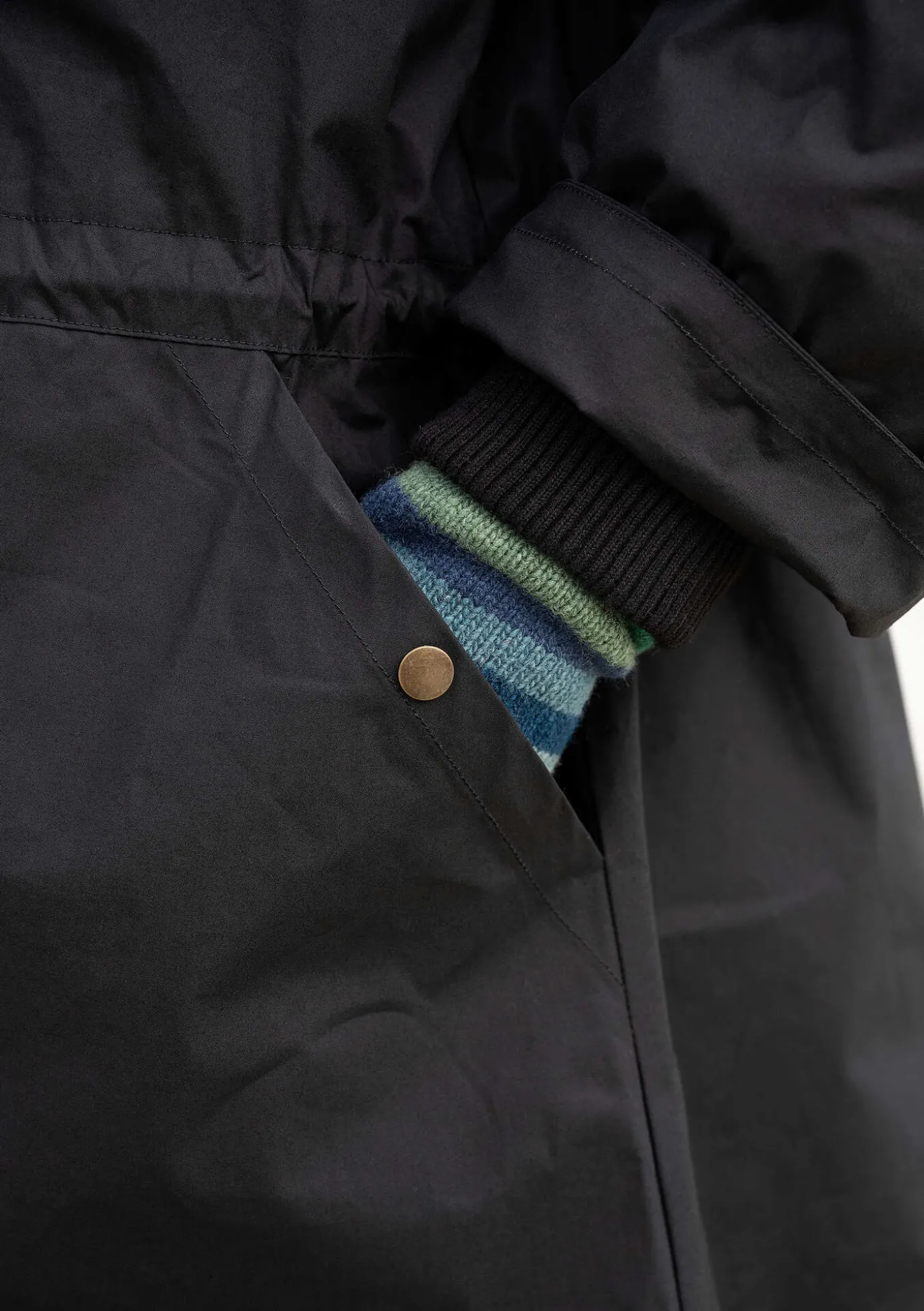 Modell mit Stehkragen, verdecktem Reißverschluss und weichen Bündchen an den Ärmelabschlüssen. Sowohl einfarbig als auch mit einem hübschen Punktedruck zu haben. Tunnelzug mit Stoppern und Lederdetails in der Taille, für mehrere Tragevarianten. Große aufgesetzte Taschen mit schrägem Eingriff, dazu eine praktische Innentasche.