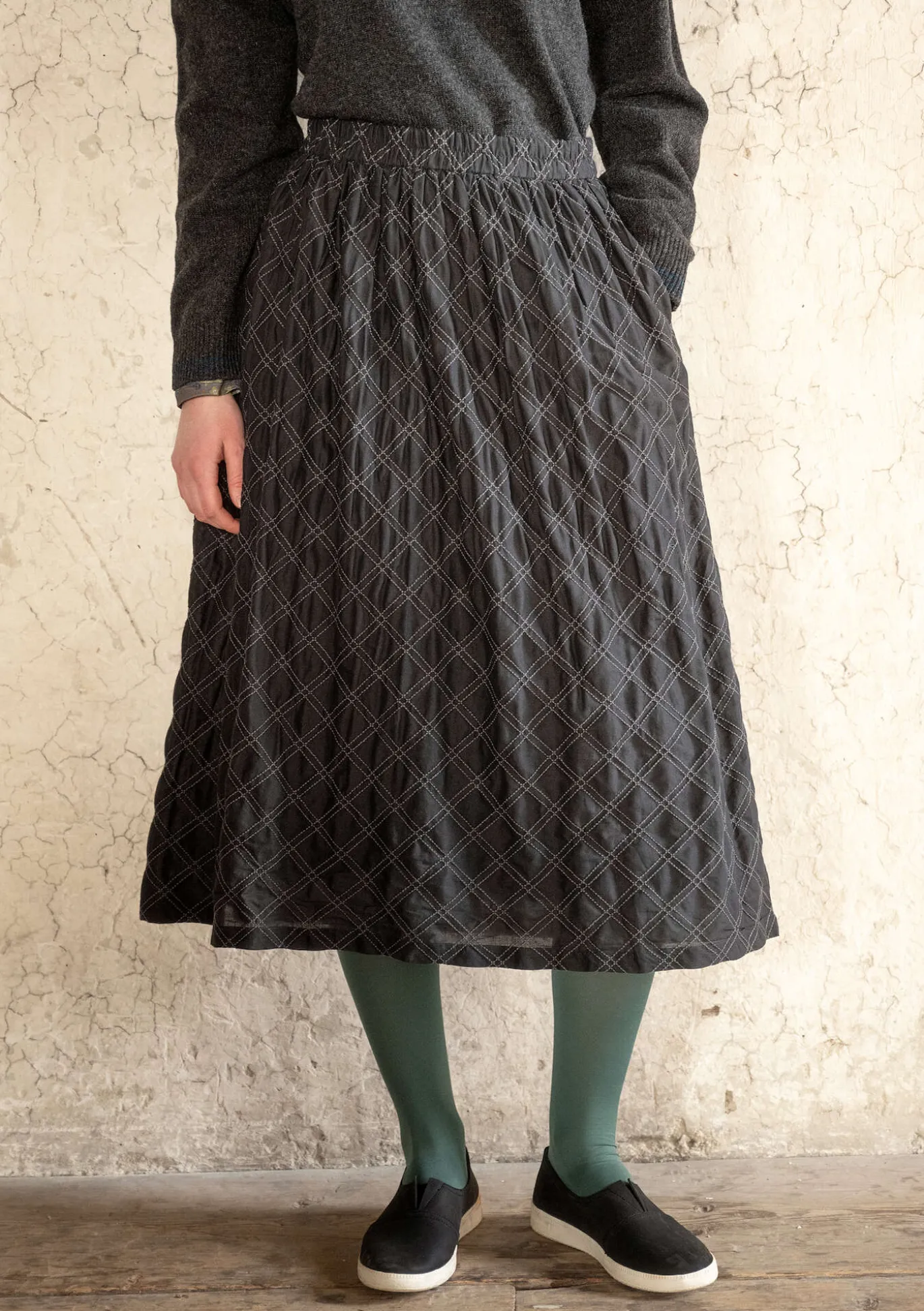 Rock mit Ton in Ton gehaltener Allover-Stickerei im hübschen Karodessin. Innen liegender Gummizug im Bund und praktische Seitentaschen.