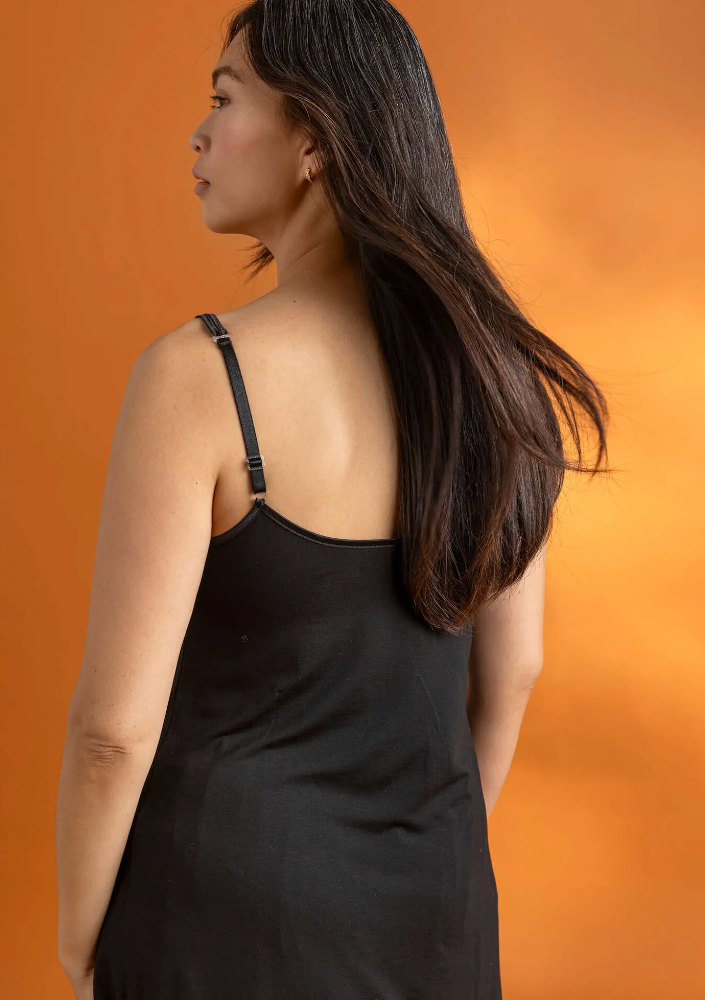 Ärmelloses Kleid aus einer weichen, schmiegsamen Qualität. Hinten leicht abgerundetes Modell mit V-Ausschnitt. Schmale verstellbare Träger. Ideal auch als Unterkleid zu tragen.