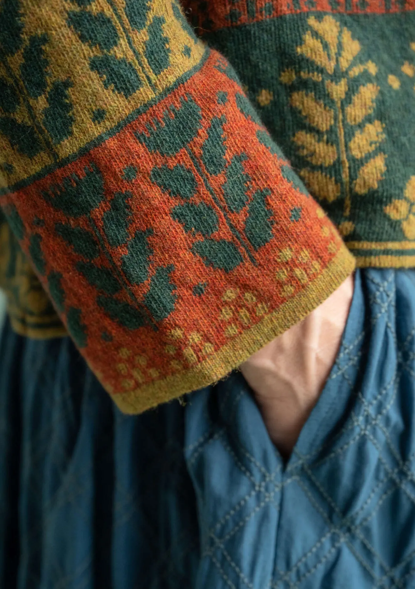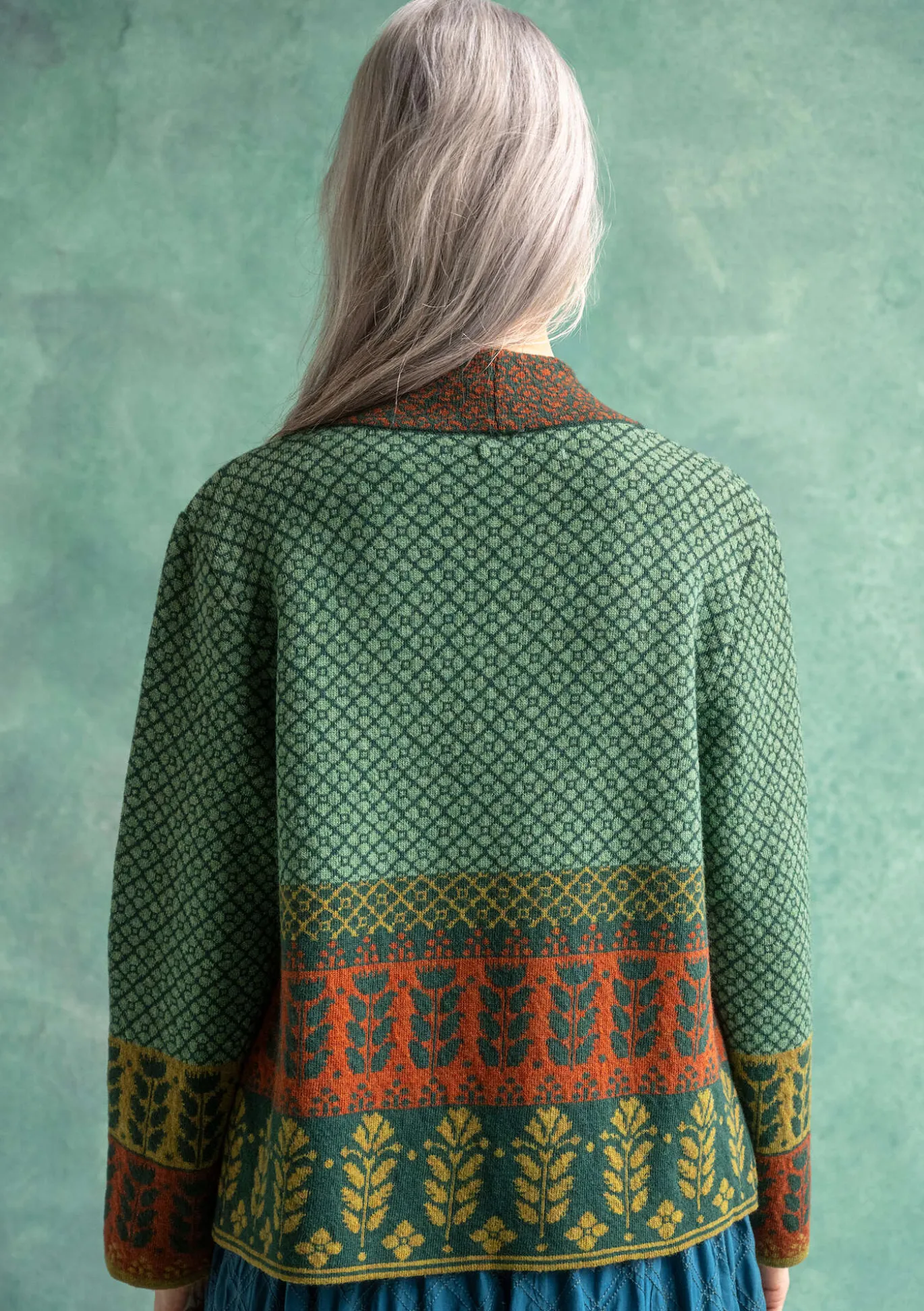 Überlappend gearbeitete Jacquardstrickjacke mit langen Ärmeln. Wunderschönes Bordürenmuster. Mit dekorativem Perlmuttknopf und Häkelöse zu schließen.