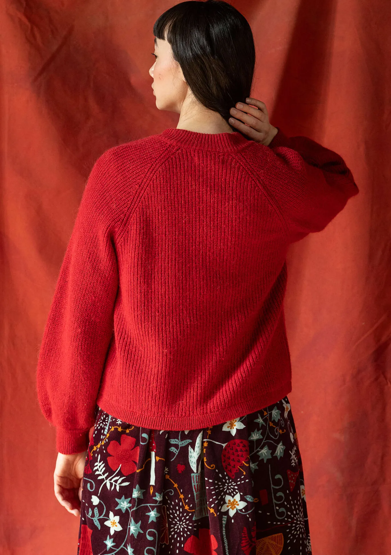 Patentstrickjacke mit langen, pludrigen Raglanärmeln und Perlmuttknöpfen. Gerippte Kragenblende und Rippbündchen an den Ärmeln.