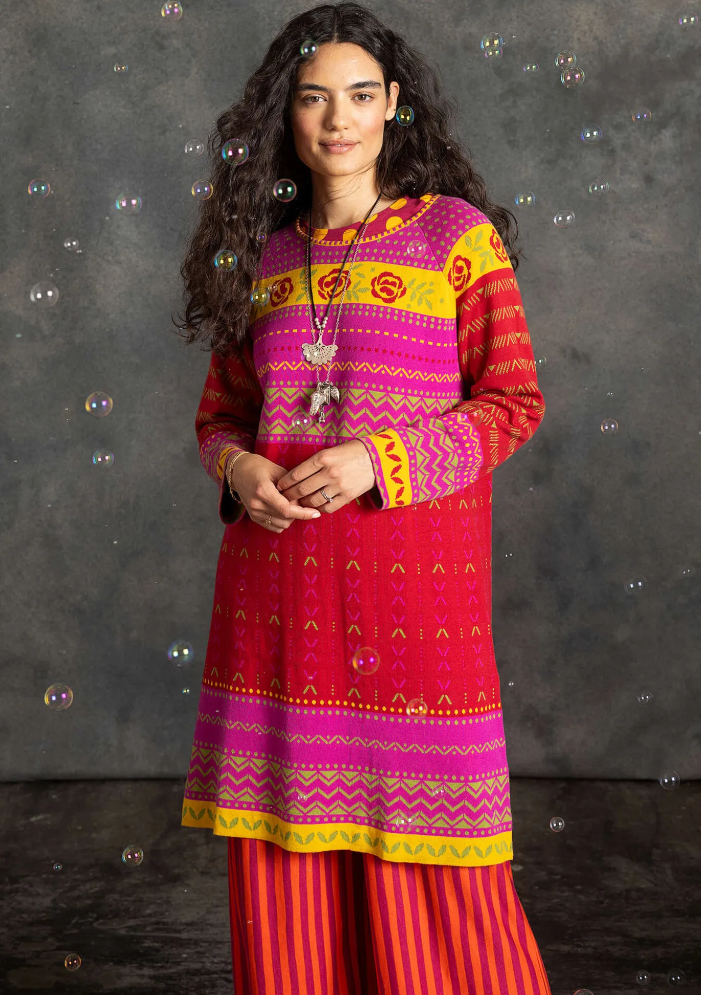 Jacquardstrickkleid mit langen Ärmeln, rundem Ausschnitt und schöner Saumweite. Hübsch gearbeitetes Modell mit umlaufender Rosenbordüre an Ausschnitt und Schulterpartie.