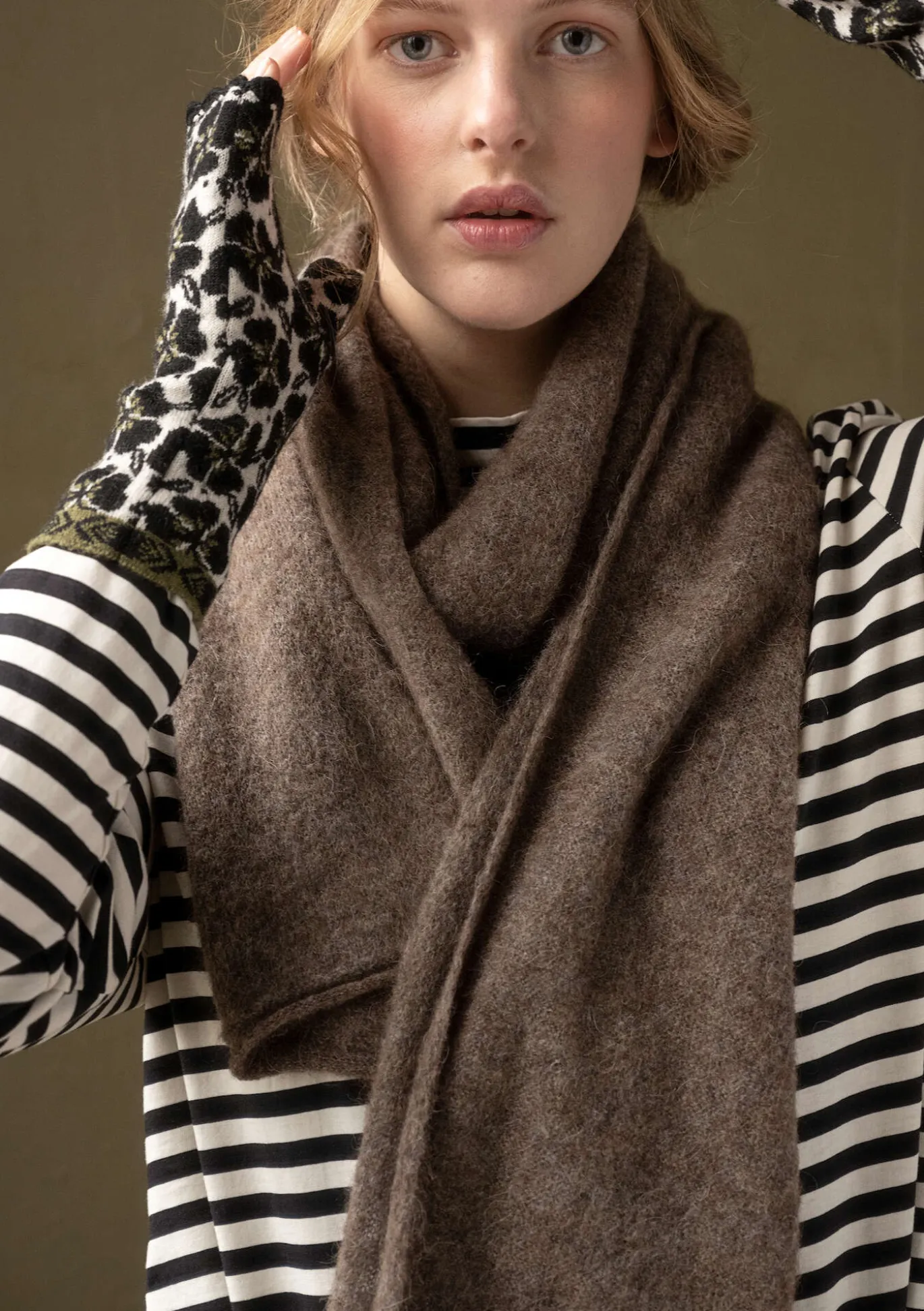 Wärmender Schal mit hübschen Rollkanten an den Schmalseiten. Gestrickt aus einem weichen, leicht flauschigen Alpakawollgemisch.