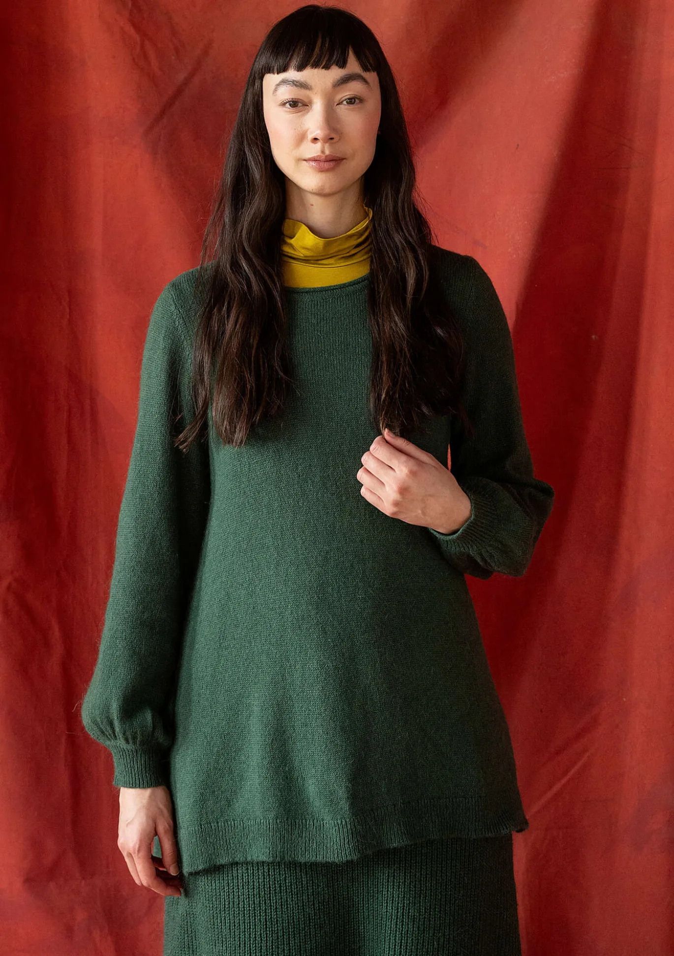 Glattstricktunika aus weichem Alpakawollgemisch, mit Seitenschlitzen. Pludrige lange Ärmel und Rundhalsausschnitt mit Rollkante. Rippbündchen an Ärmelabschlüssen und Saum.