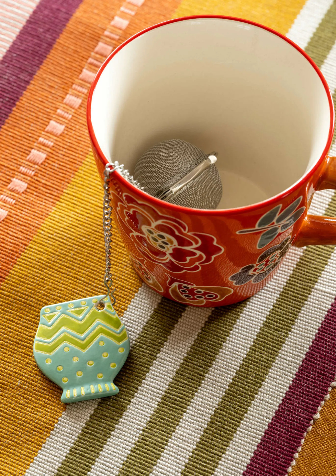 Teesieb aus Metall, für eine köstlich wärmende Tasse Tee. Mit Keramikanhänger in Form eines gemusterten Blumentopfs.