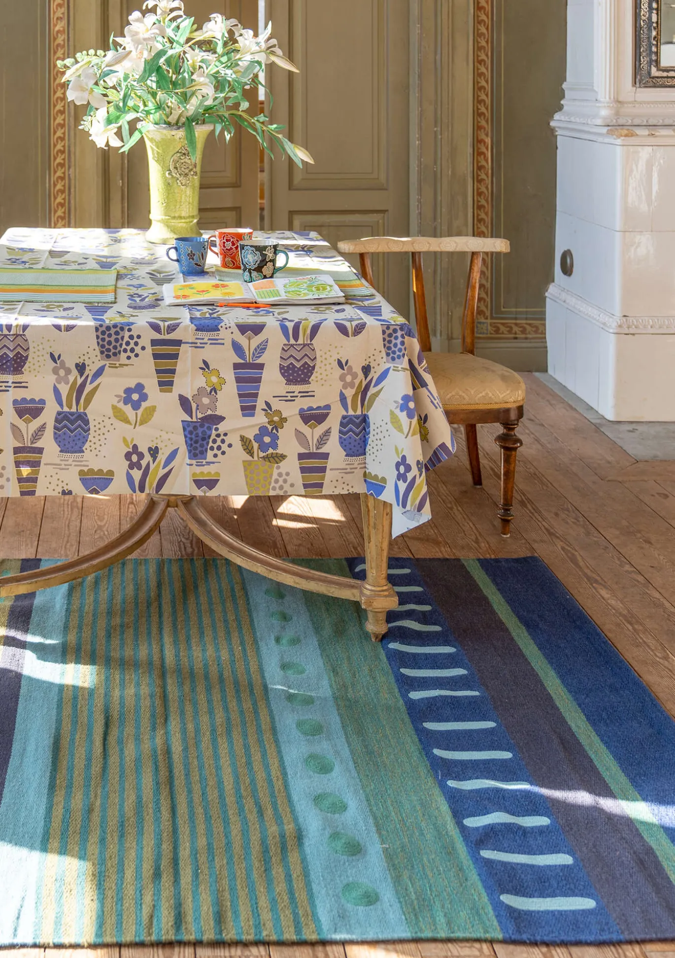 Großer Wollteppich mit unregelmäßigen Streifen in einem wunderbar fröhlichen Farbmix. Strapazierfähige Wollqualität mit hübschen Stickereien.
