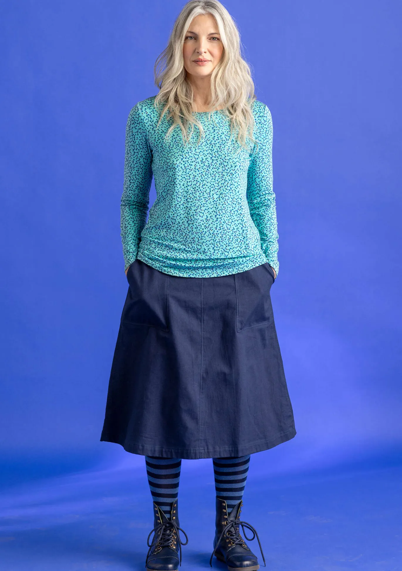 Leicht ausgestelltes Modell mit praktischen Taschen. Hübsche Details wie Dreinadelnähte an den Seiten und kontrastierende Riegel an den Taschen. Bequemer Dehnbund hinten und Printdetail auf der Bundinnenseite.