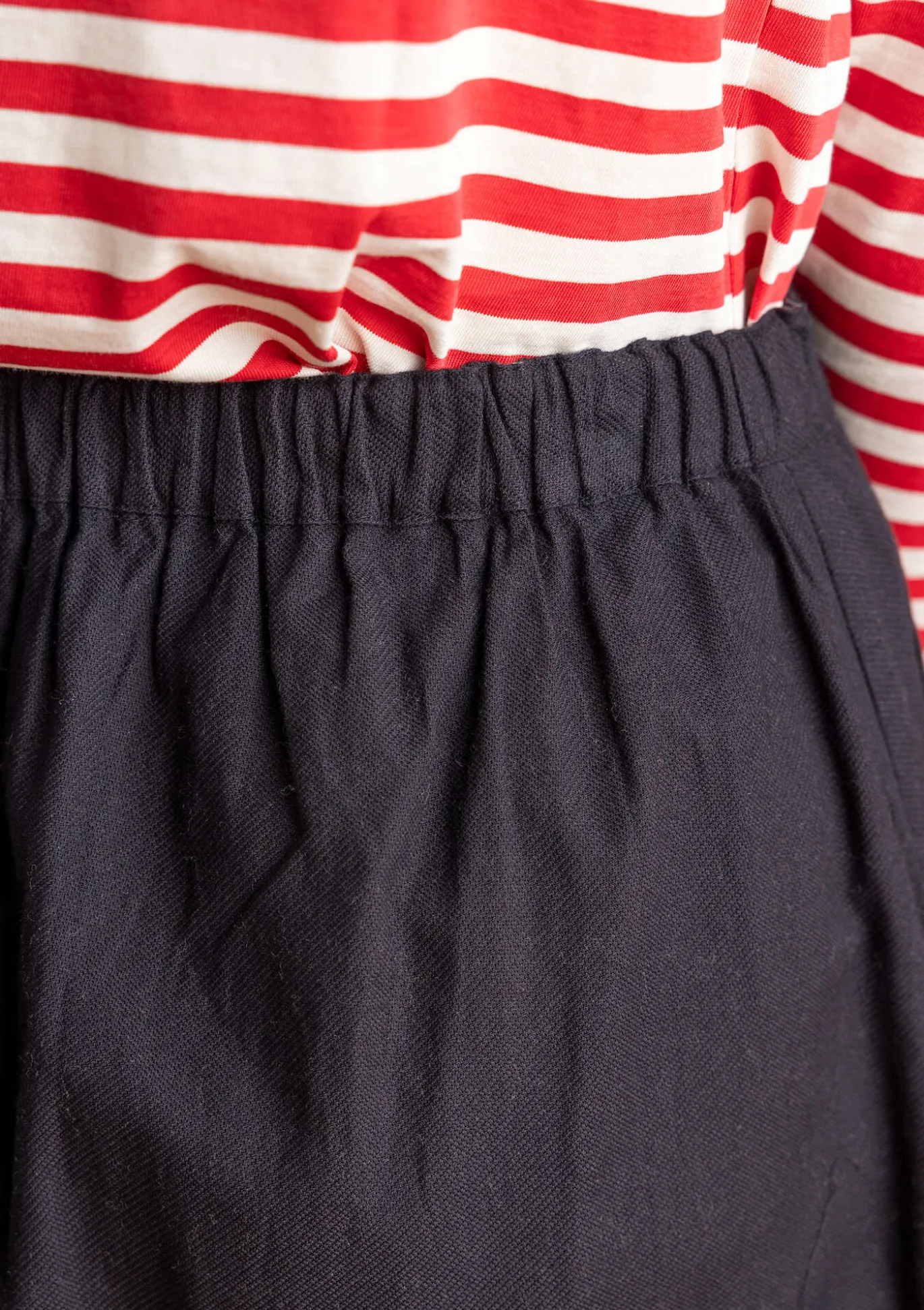 Leicht ausgestelltes Modell mit praktischen Taschen. Hübsche Details wie Dreinadelnähte an den Seiten und kontrastierende Riegel an den Taschen. Bequemer Dehnbund hinten und Printdetail auf der Bundinnenseite.
