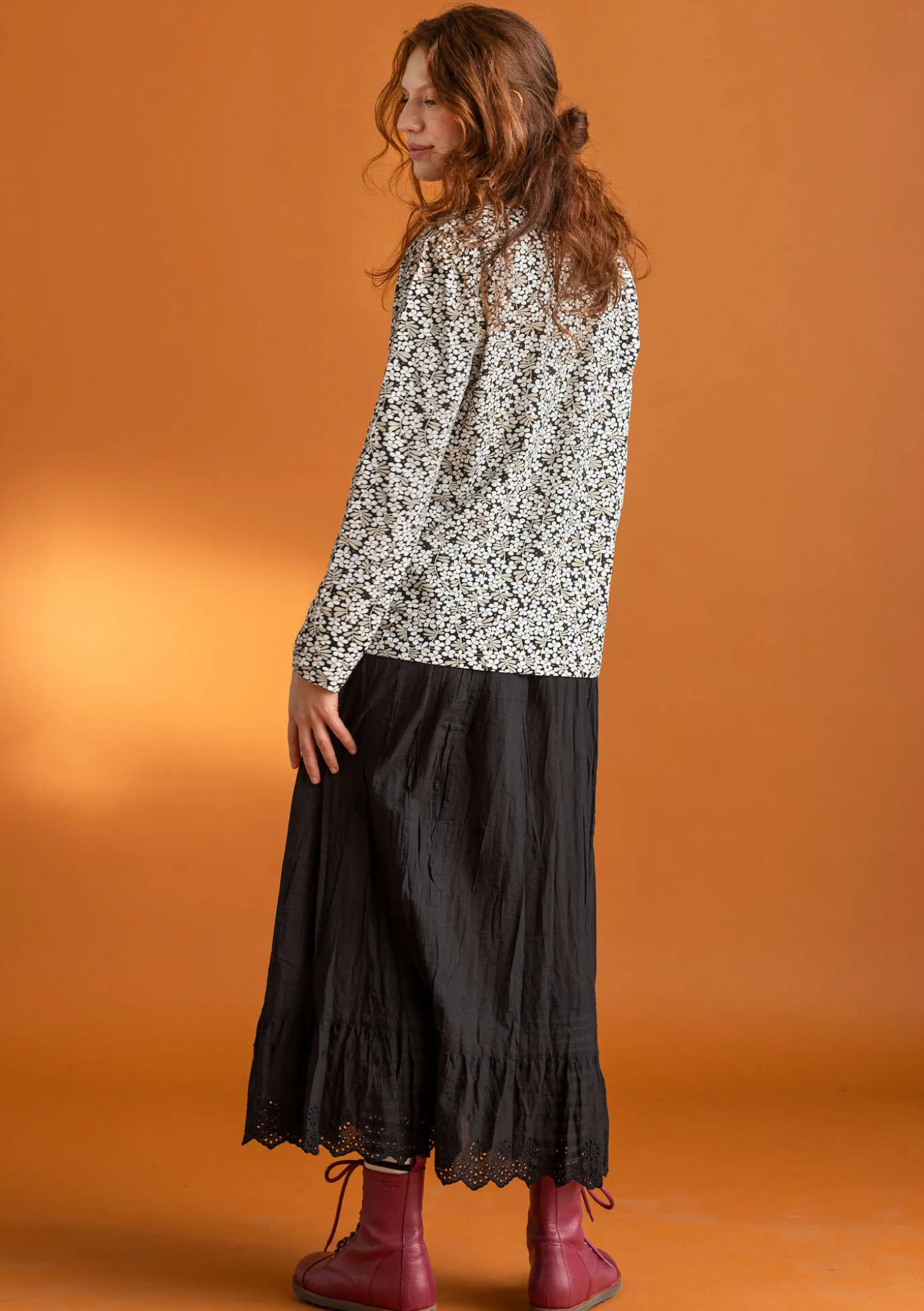 Schlichtes Modell mit Dehnbund. Bordüre mit Lochstickereien und Stickpunkten am Saum. Bund per Knopf verstellbar, für eine optimale Passform.