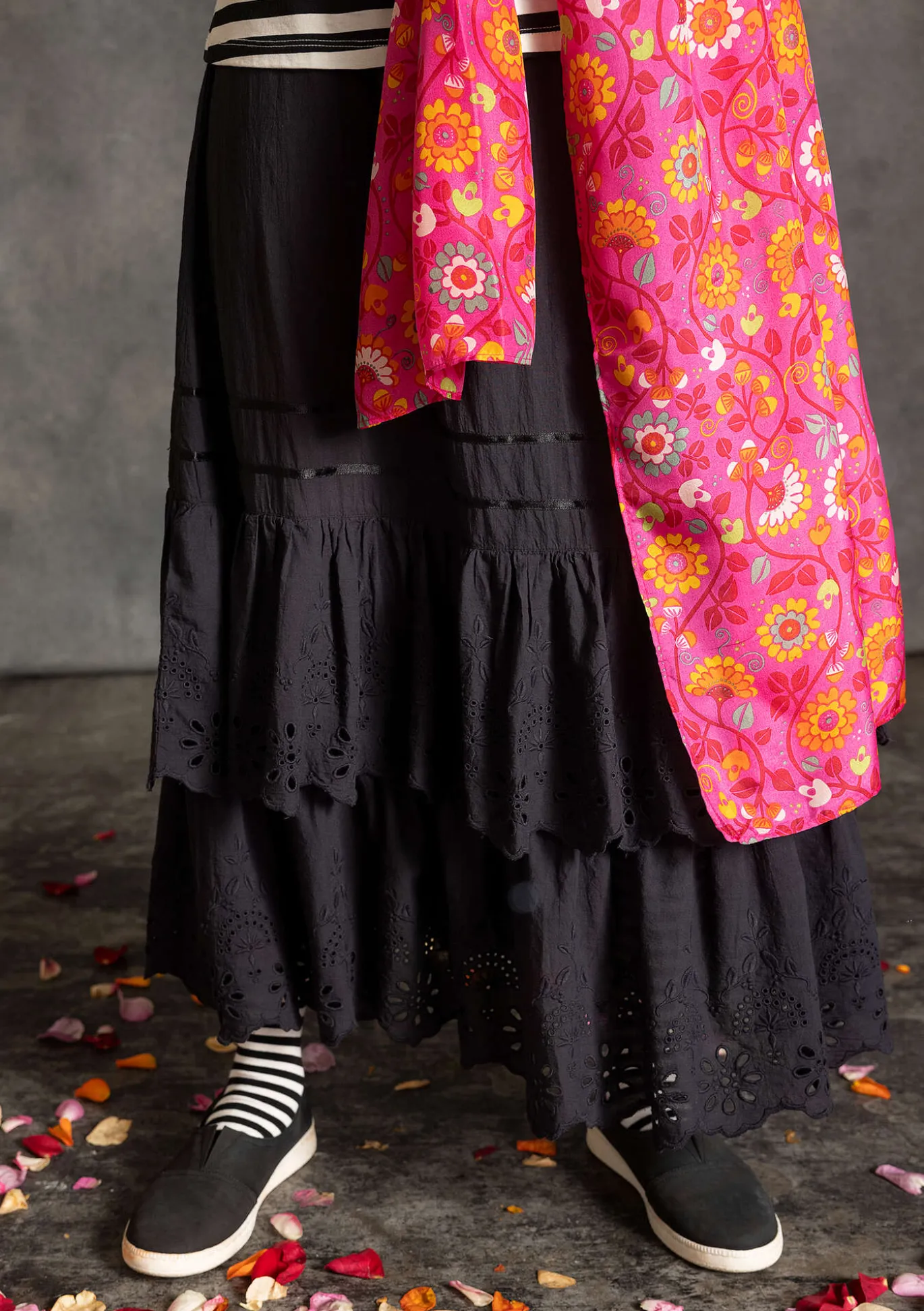 Verzierter Rock, schön entweder solo oder als Unterrock zu tragen. Modell mit zwei überlappend gearbeiteten Stufen mit Lochstickerei. Zwei aufgenähte Satinbandstreifen oberhalb der Stufen. Dehnbund mit Tunnelzug.