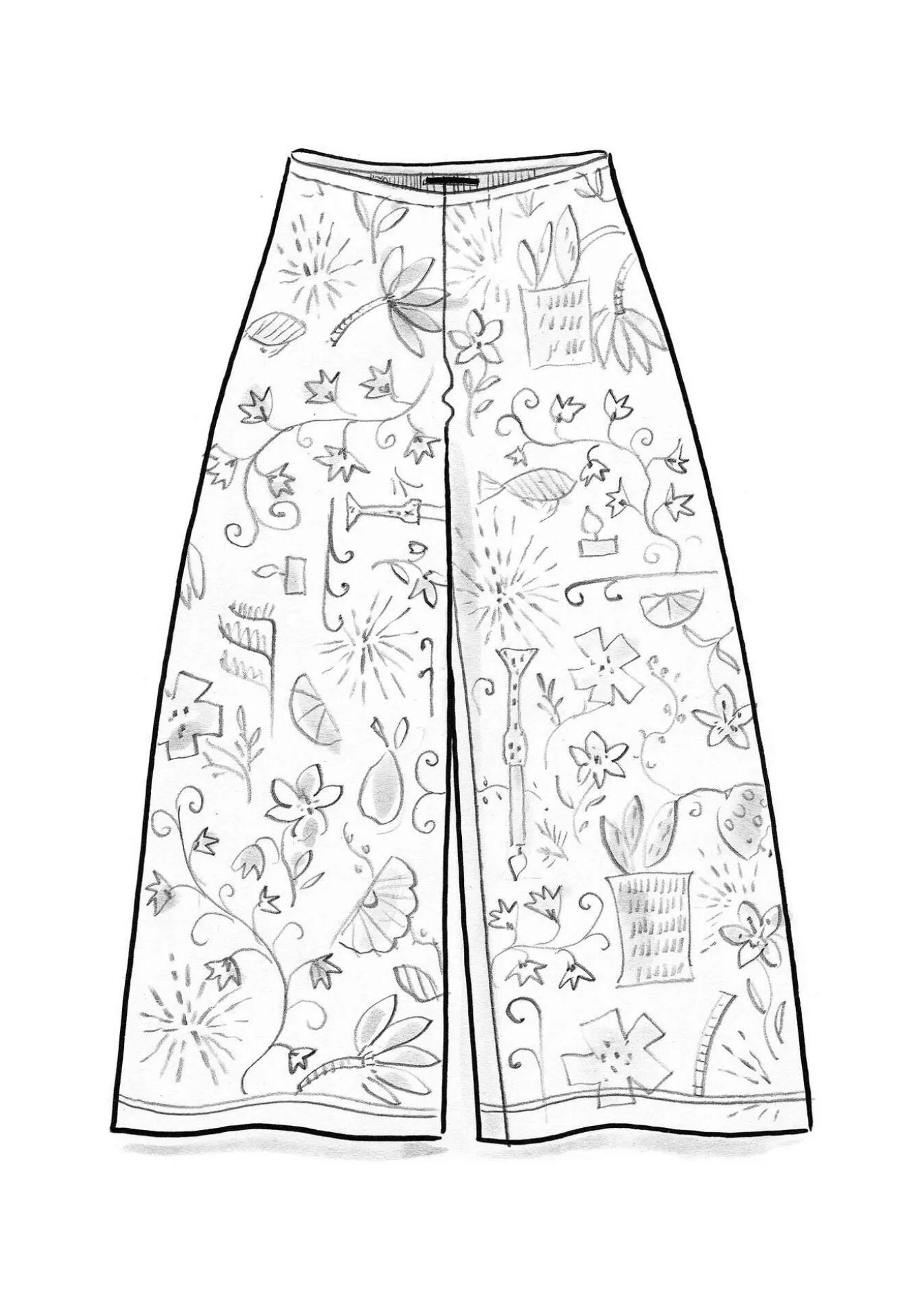Bedruckte, etwas überknöchellange Velourshose mit schwingender Saumweite. Bund mit innenseitigem Gummizug.