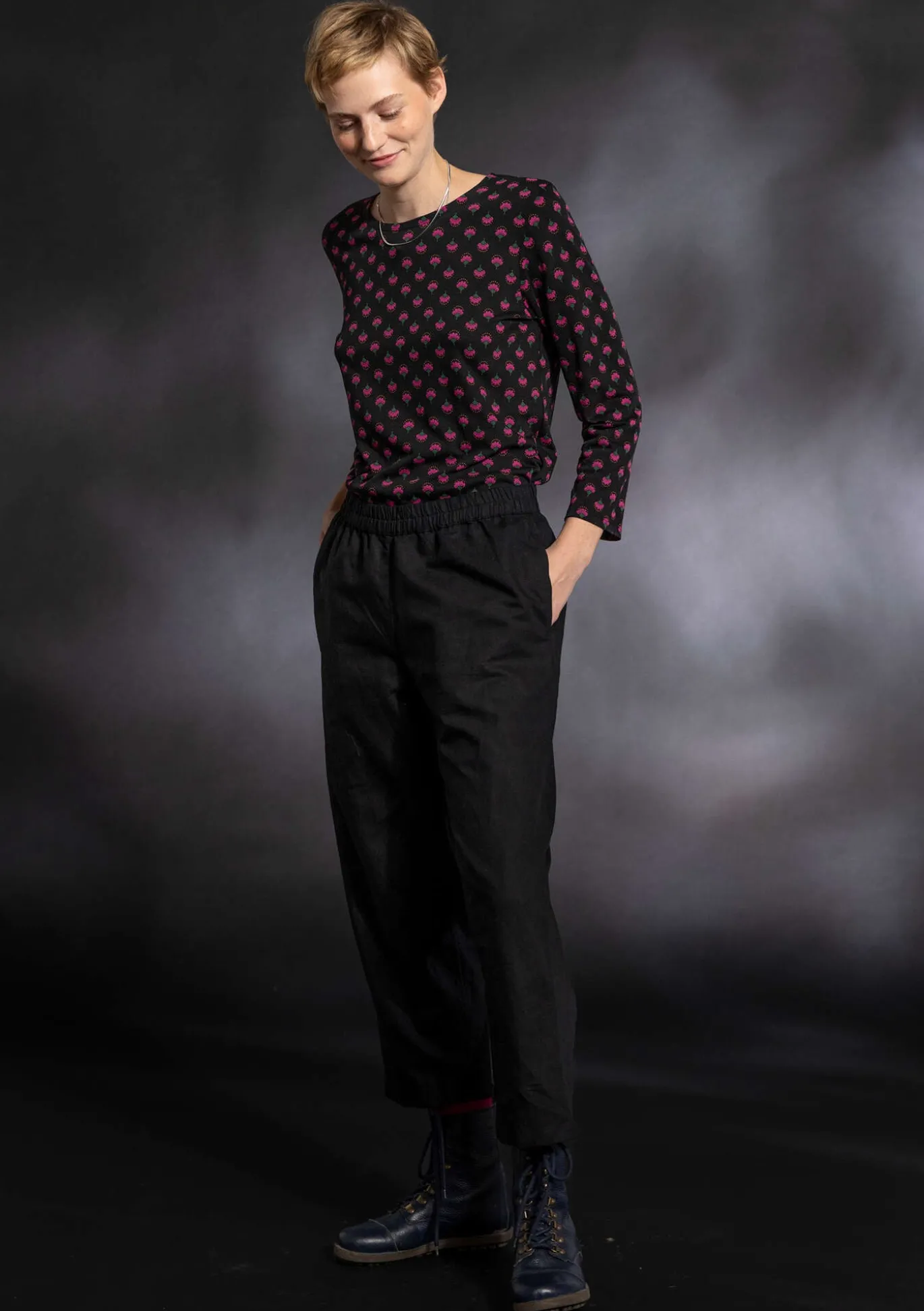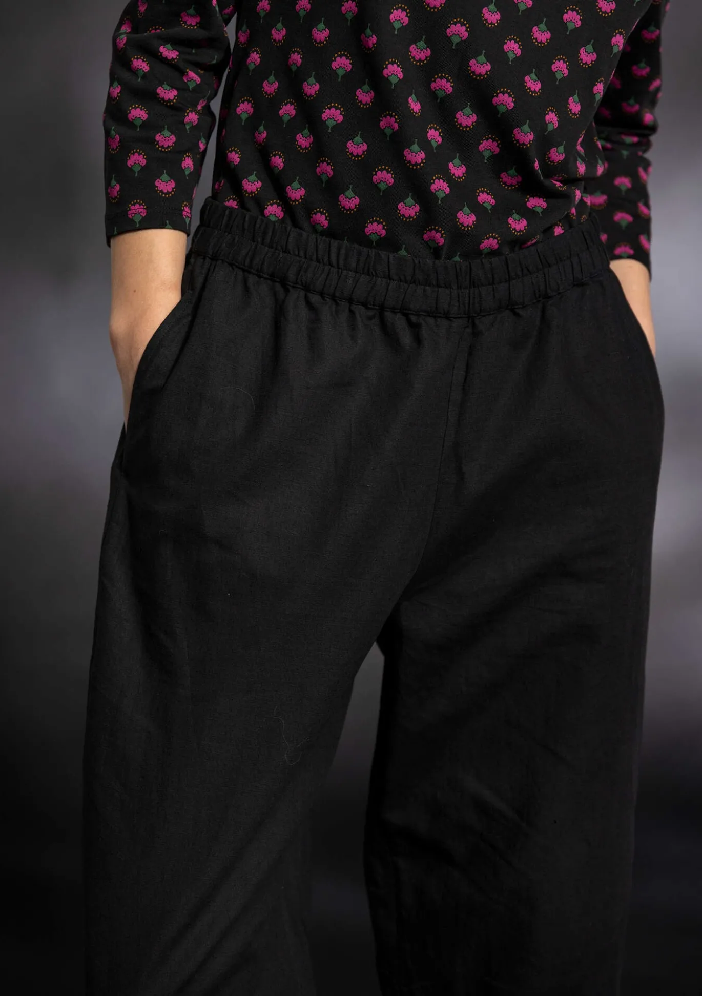 Vielseitige knöchellange Hose. Modell mit bequemem Dehnbund und Seitentaschen. Aus Reststoff gearbeitet.