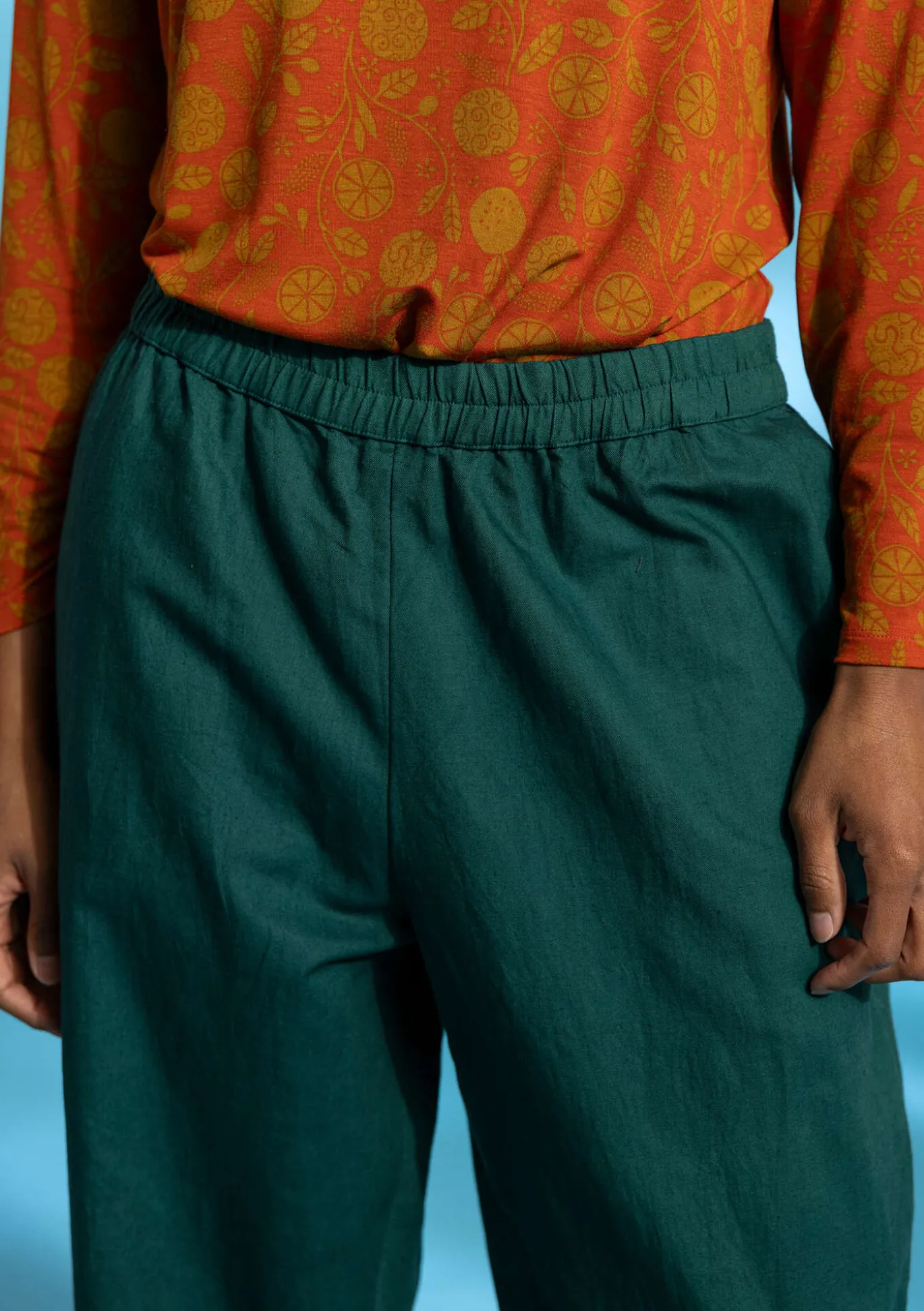 Vielseitige knöchellange Hose. Modell mit bequemem Dehnbund und Seitentaschen. Aus Reststoff gearbeitet.