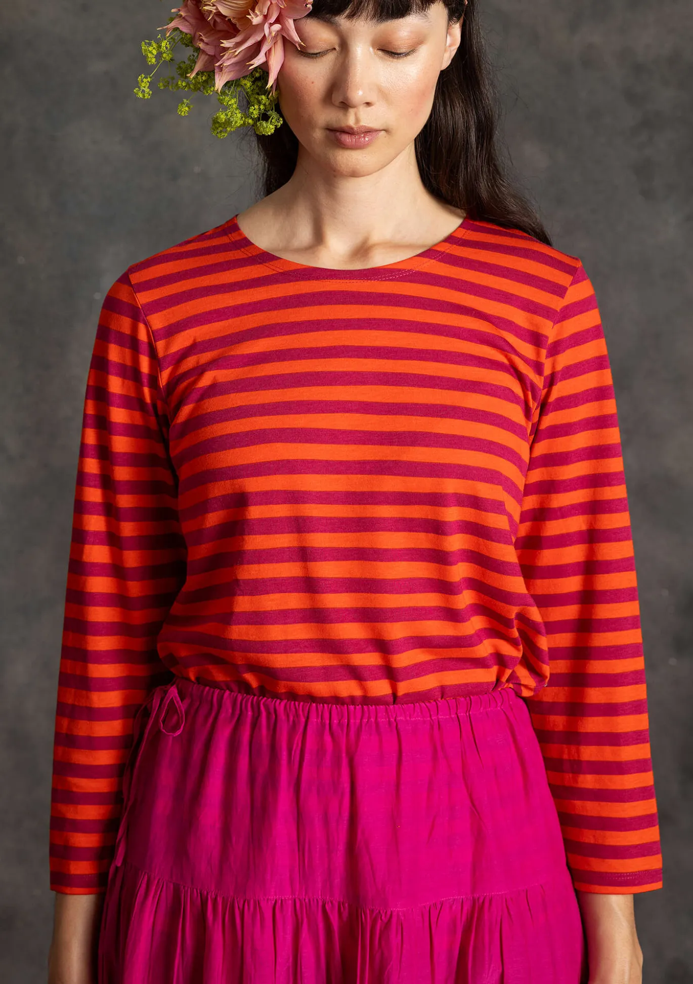 Weiter Rock aus einem herrlichen Baumwolle/Seide-Gewebe mit schönem Fall. Hübsches Modell mit vier Stufen und Tunnelzug im bequemen Dehnbund.