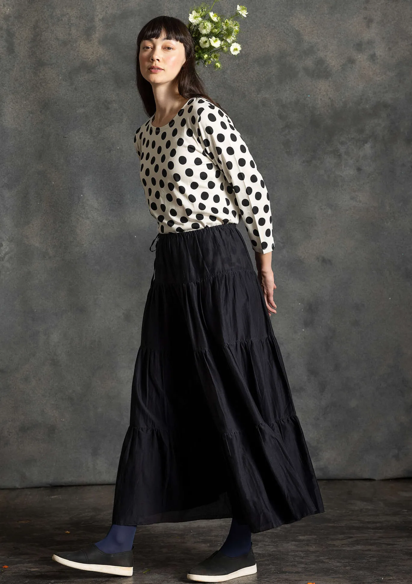 Weiter Rock aus einem herrlichen Baumwolle/Seide-Gewebe mit schönem Fall. Hübsches Modell mit vier Stufen und Tunnelzug im bequemen Dehnbund.
