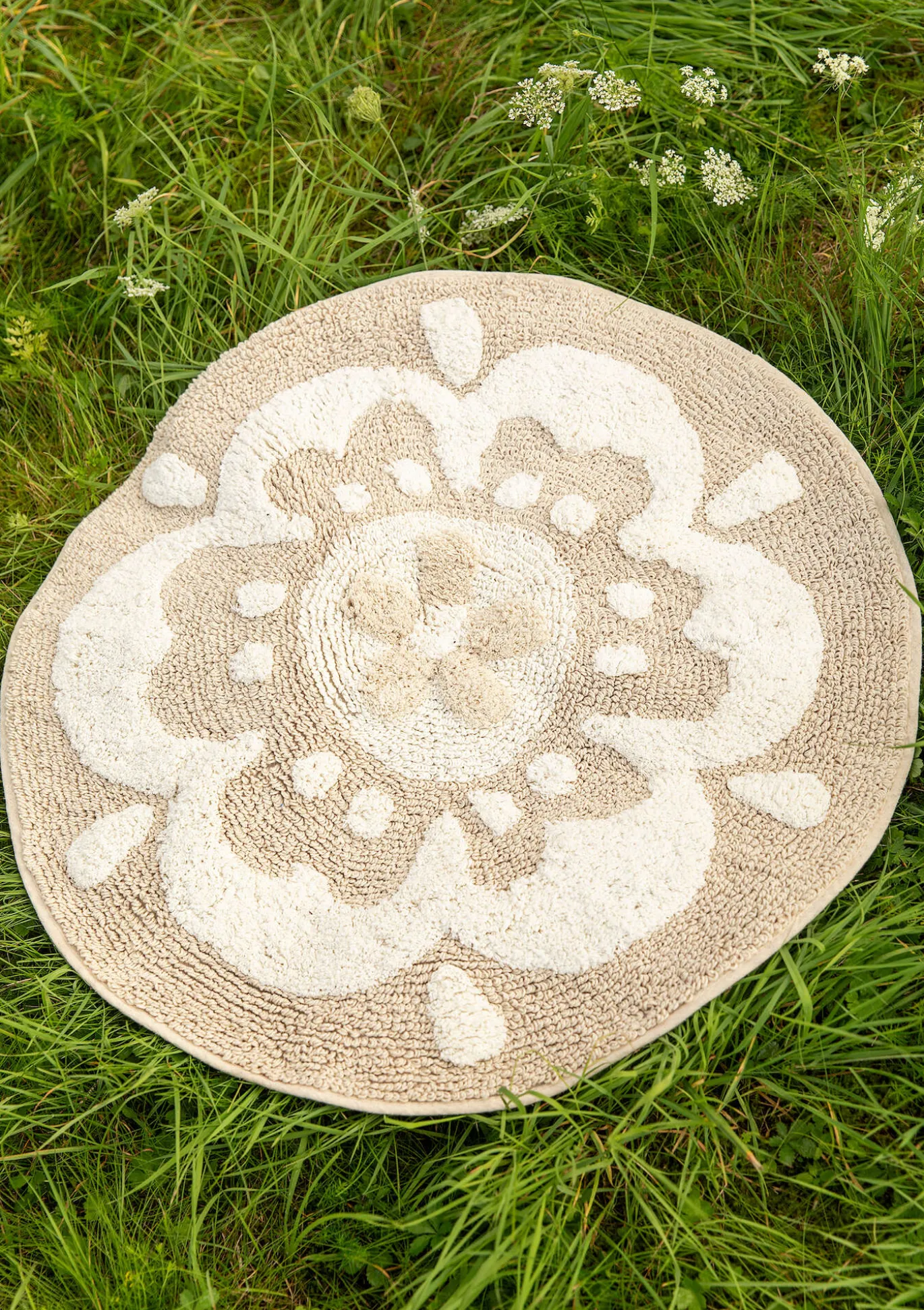 Runder Badteppich mit einer großen Blüte. Getuftetes Modell mit Schlingen und geschnittenem Flor. Rutschfeste Unterseite.