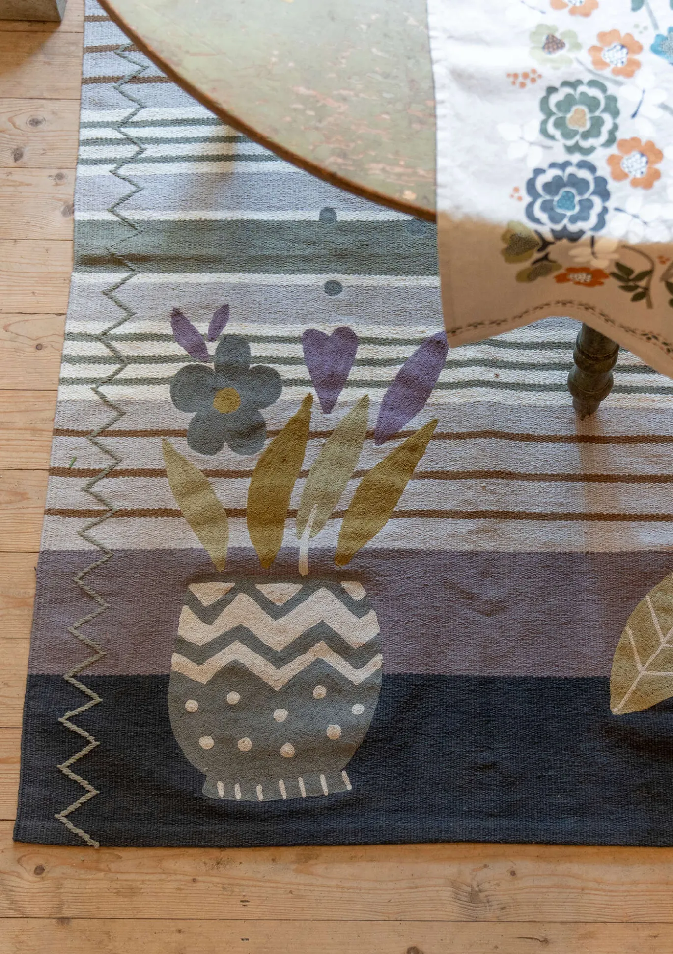 Webteppich aus Bio-Baumwolle, mit garngefärbten Streifen und aufgestickten Blumentöpfen.