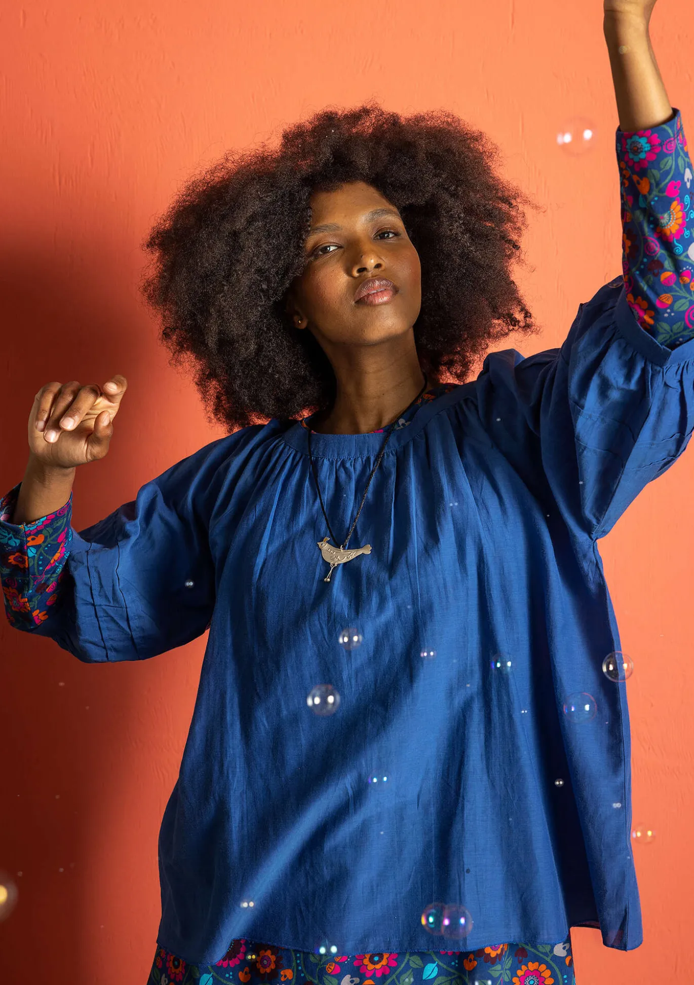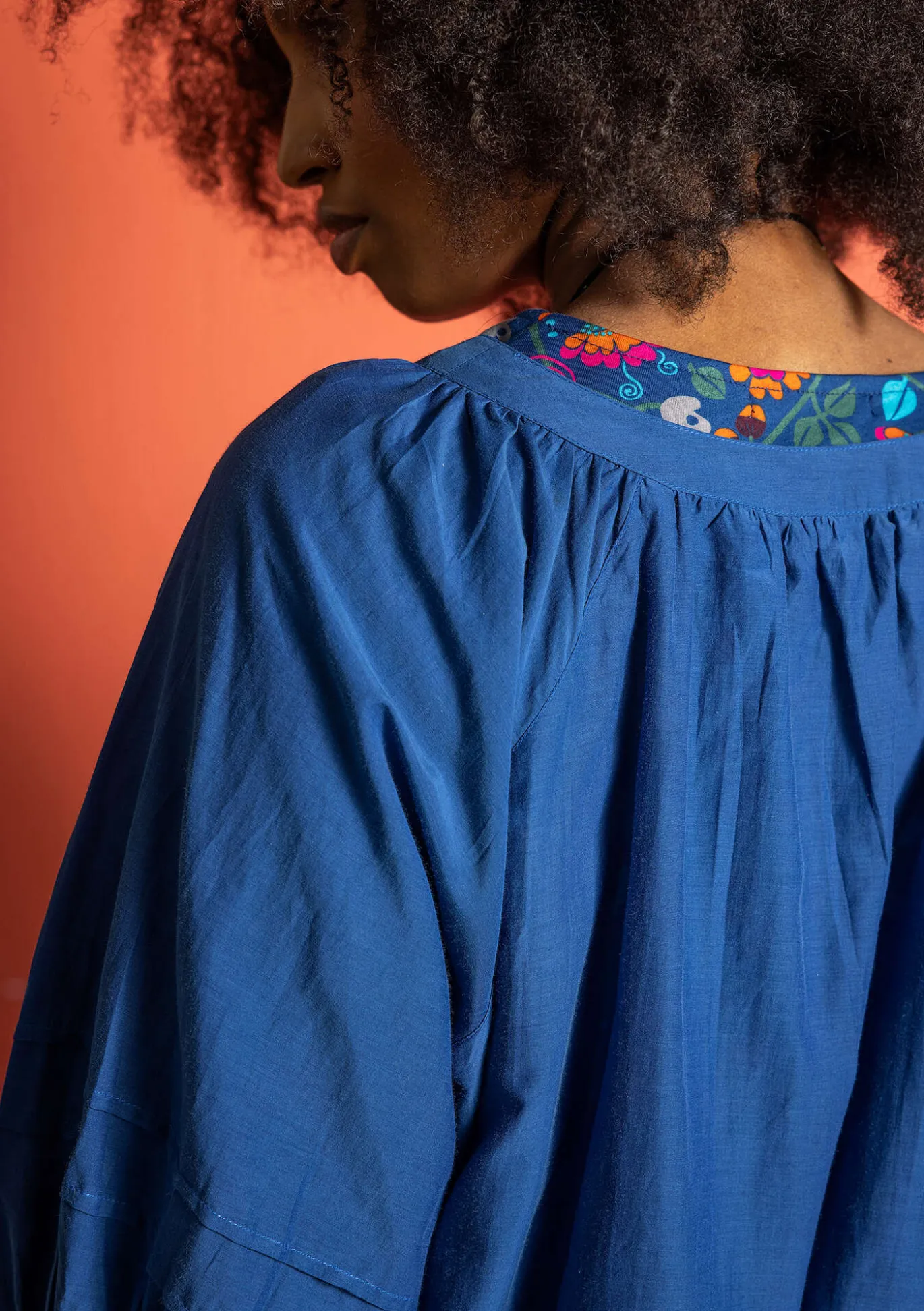 Pludrige Bluse mit großzügiger Weite. Runder Ausschnitt mit angekräuselter Blende. 3/4-Ärmel mit zwei Biesen und angekräuselten Abschlüssen.