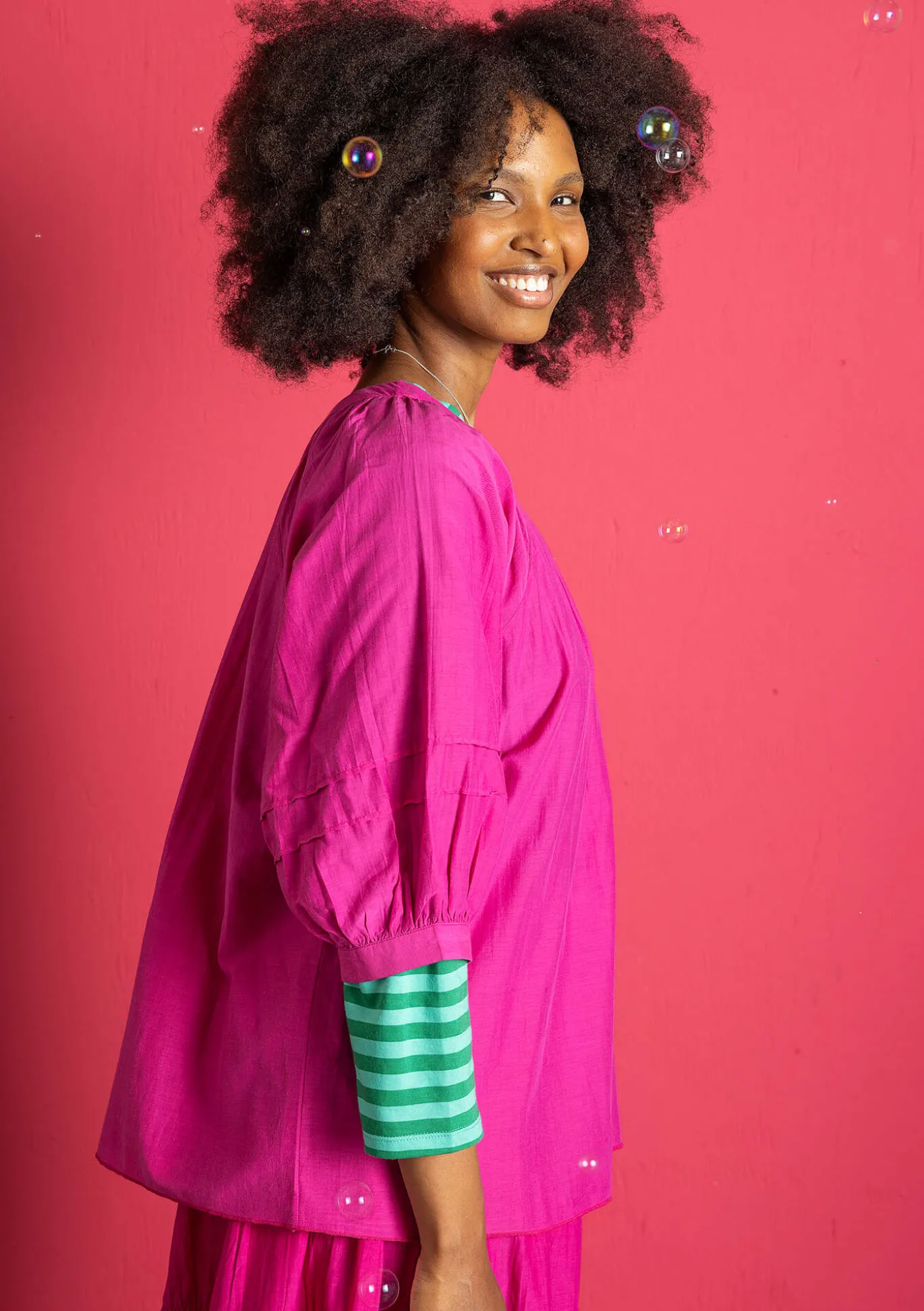 Pludrige Bluse mit großzügiger Weite. Runder Ausschnitt mit angekräuselter Blende. 3/4-Ärmel mit zwei Biesen und angekräuselten Abschlüssen.