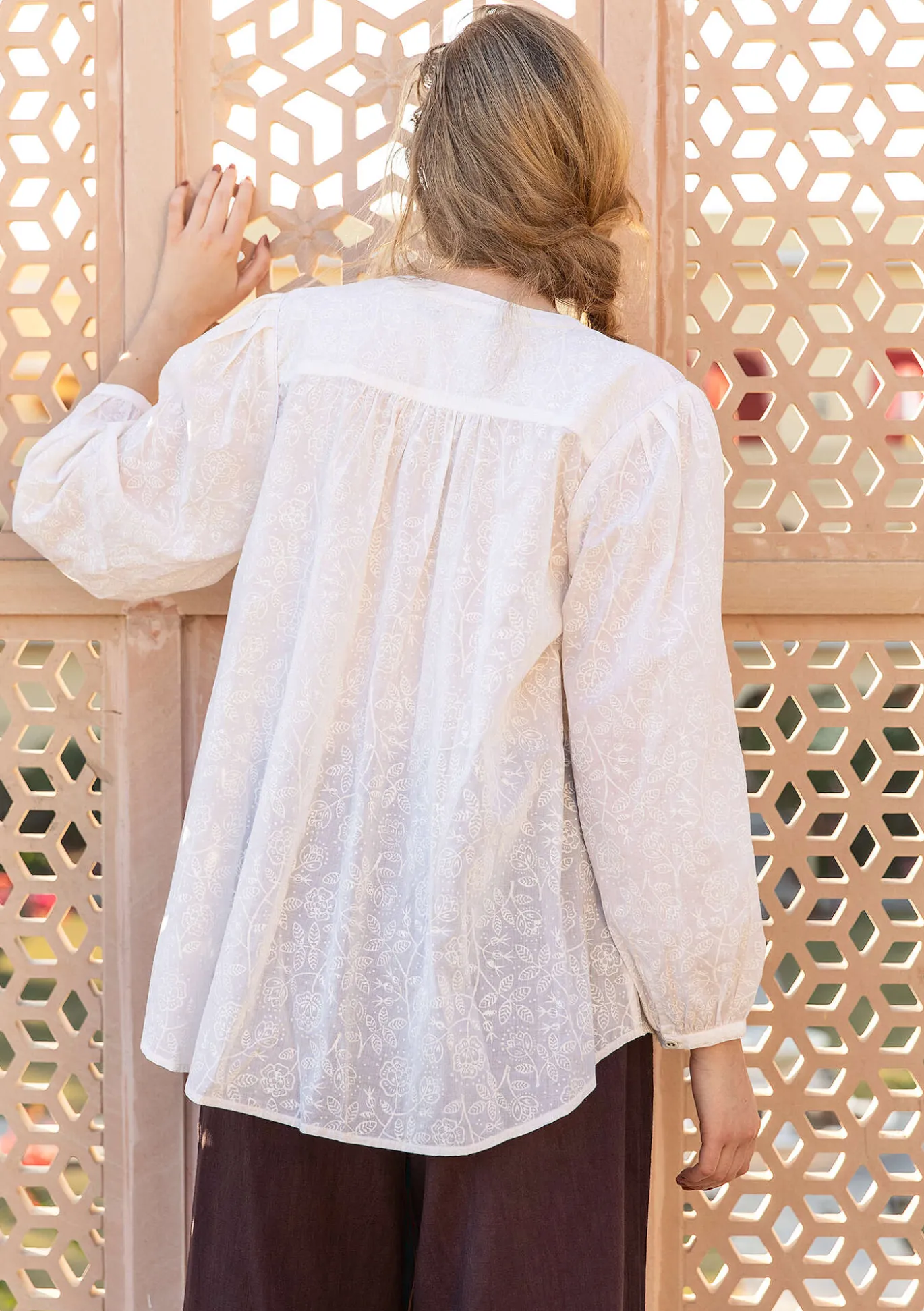 Blockdruck-Bluse mit hübschen Vogesen-Rosen. Modell mit abgerundetem Saum und Knopfleiste mit Kellerfalte, für eine schöne Weite. Stehkragen, Stoffknöpfe und Passe auf dem Rückenteil. Pludrige lange Ärmel mit Paspel an der Schulternaht.