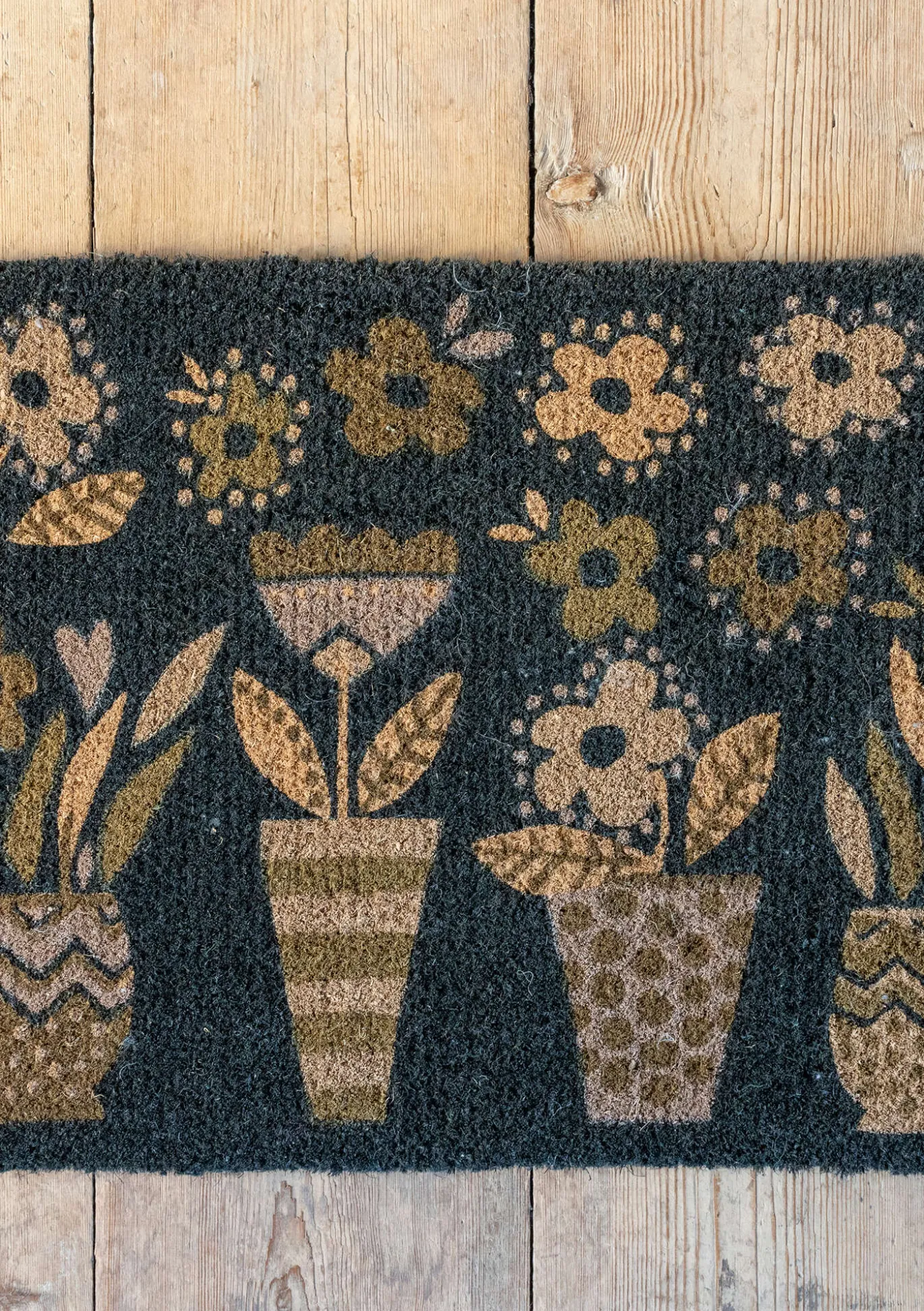 Siebbedruckte Fußmatte aus Kokosfaser, im verspielten Dessin mit Blumen und Blumentöpfen.