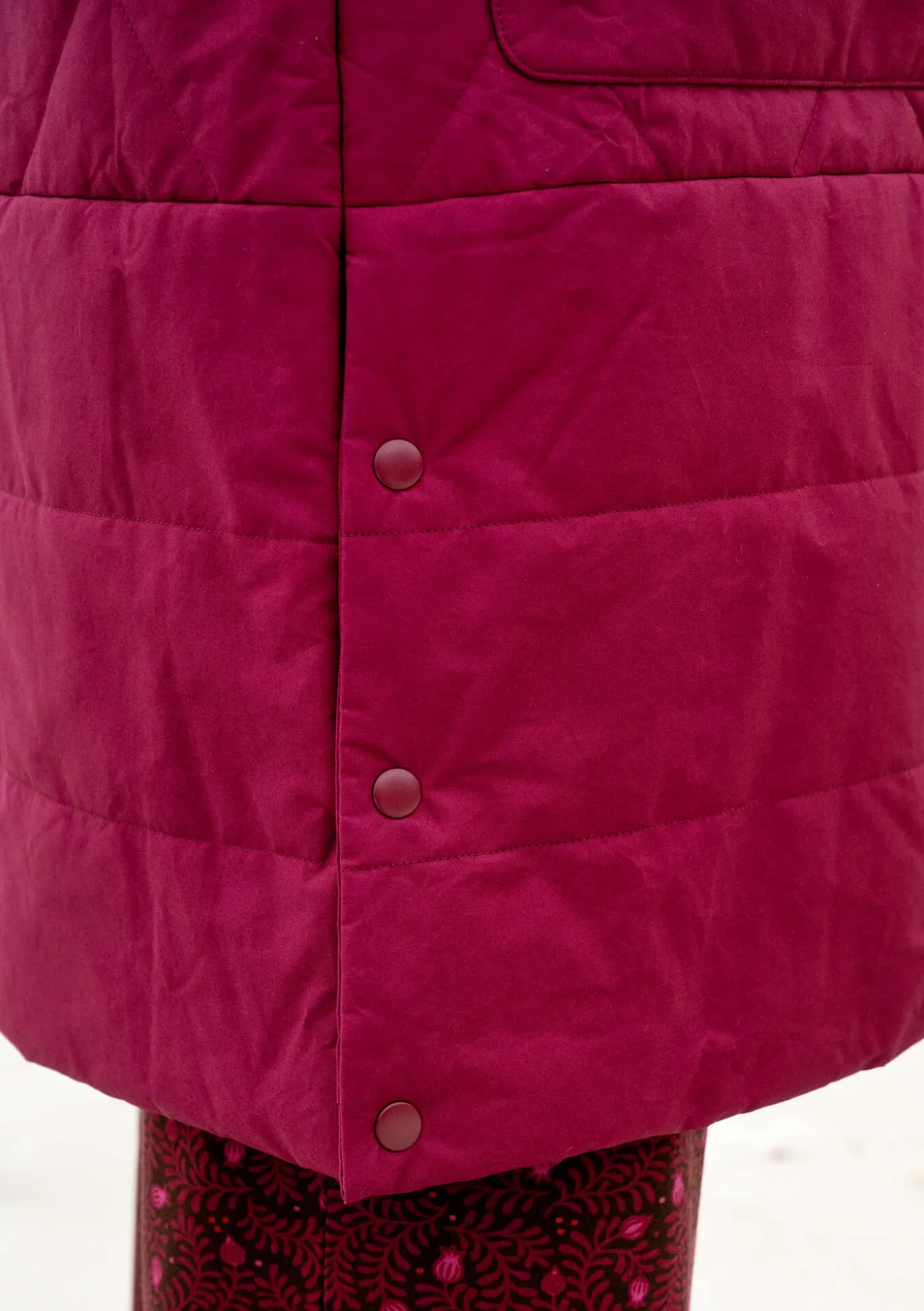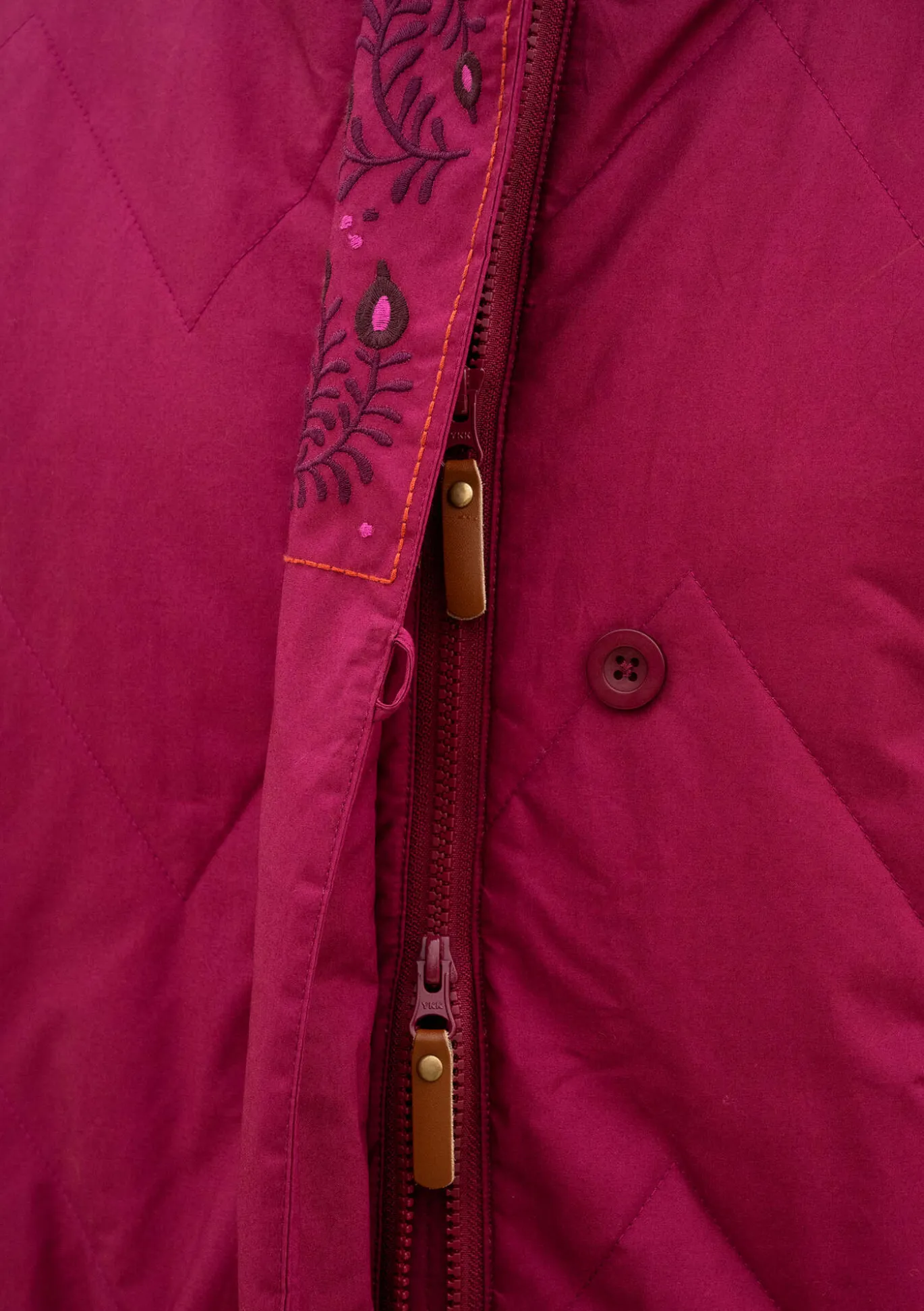 Durchgehend gefütterter Steppmantel mit langen Ärmeln und per Druckknöpfen verstellbaren Seitenschlitzen. Verdeckter Reißverschluss mit Knopfleiste vorne in der Mitte. Große Taschen und verdeckte Ärmelbündchen. Dekorative Stickereien an Ärmelabschlüssen, Kragen und Kapuze.