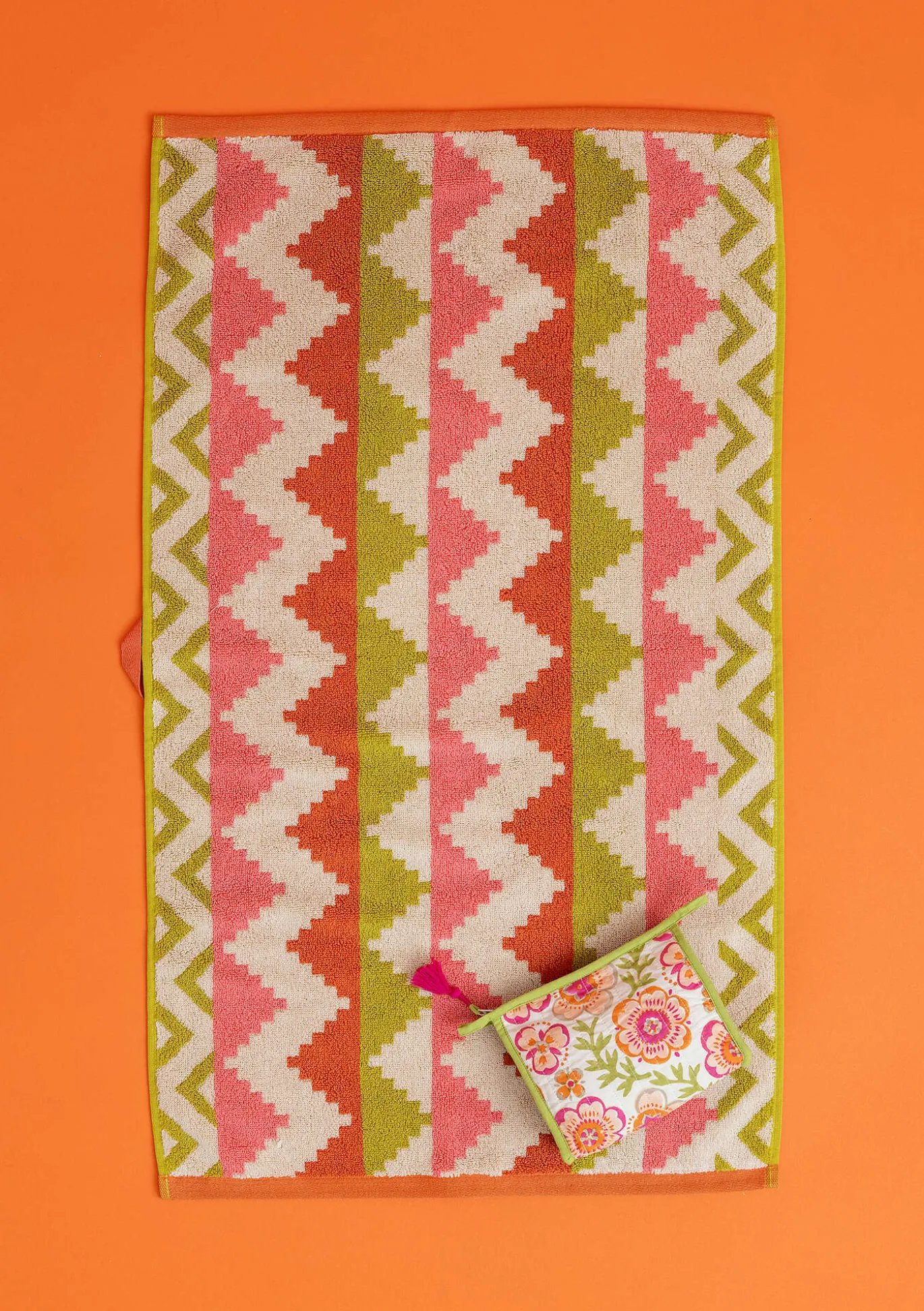 Handtuch mit Zickzackmuster und Bordüren. Kontrastierende Kanten und Aufhänger an der Stirn- und Längsseite.