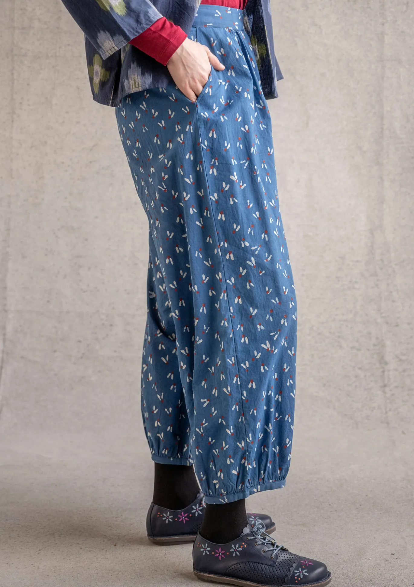Klein gemusterte Pluderhose, mithilfe von Lehm-Reservage blockbedruckt und in mehrere Farbbäder mit Pflanzenpigmenten getaucht. Modell mit innen liegendem Gummizug im Bund und praktischen Seitentaschen.