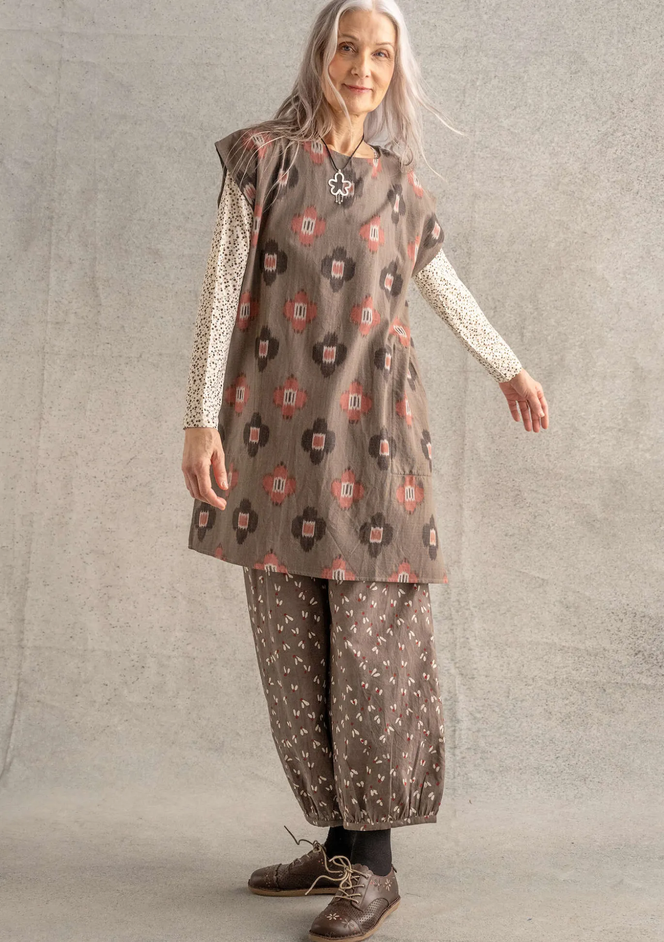 Klein gemusterte Pluderhose, mithilfe von Lehm-Reservage blockbedruckt und in mehrere Farbbäder mit Pflanzenpigmenten getaucht. Modell mit innen liegendem Gummizug im Bund und praktischen Seitentaschen.