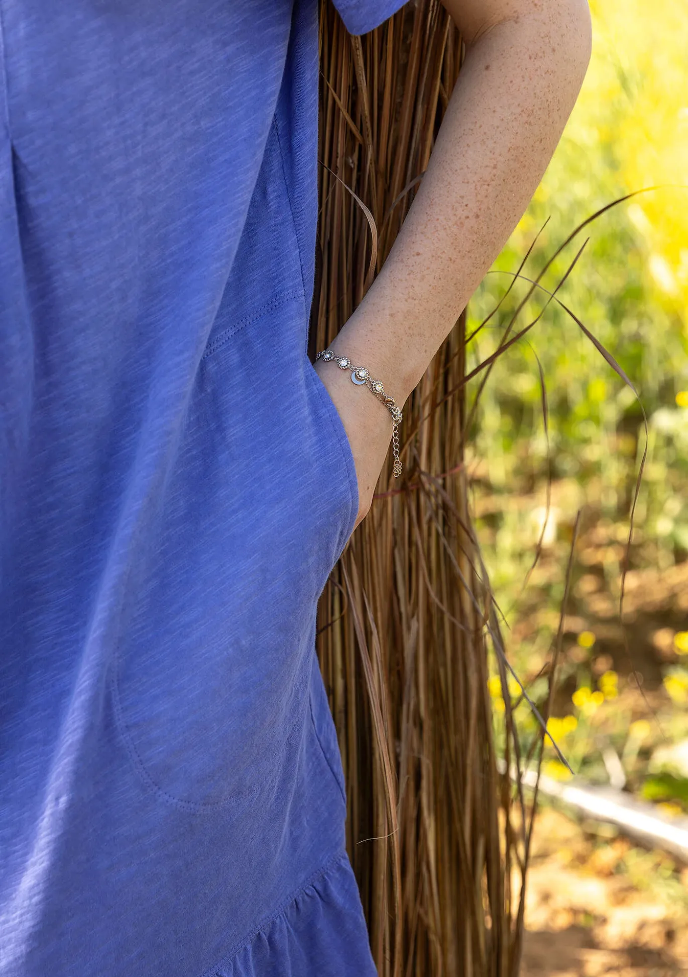 Kurzarmmodell mit Seitentaschen und breitem Volant am Saum. Knopfleiste mit gefärbten Perlmuttknöpfen und kleiner Stehkragen mit romantischer Spitze. Biesen vorne und hinten, für eine Silhouette mit schöner Saumweite.