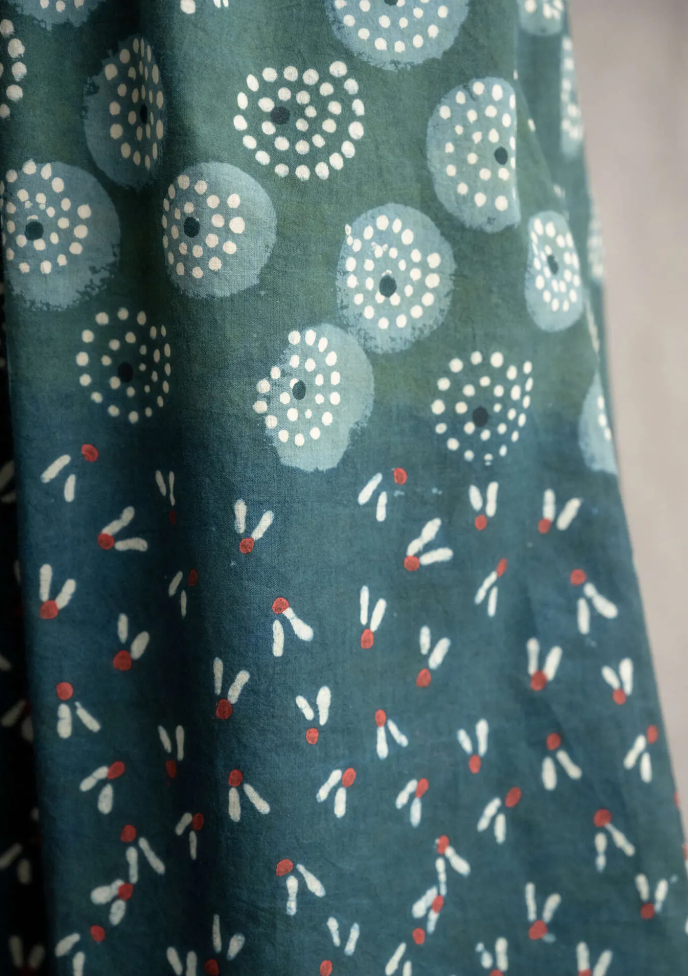 Kleid mit zwei Musterbildern, mithilfe von Lehm-Reservage blockbedruckt und mit Pflanzenpigmenten gefärbt. Vorne und hinten in Biesen gelegtes Oberteil. Im Nacken mit einem schlichten Holzknopf zu schließen. 3/4-Ärmel und Seitentaschen.