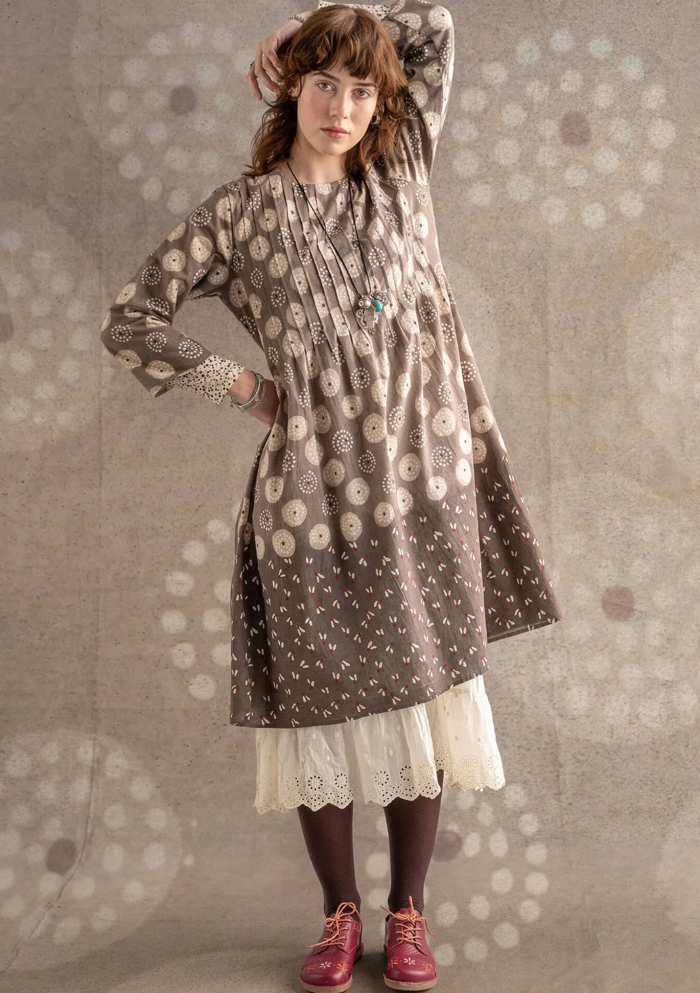 Kleid mit zwei Musterbildern, mithilfe von Lehm-Reservage blockbedruckt und mit Pflanzenpigmenten gefärbt. Vorne und hinten in Biesen gelegtes Oberteil. Im Nacken mit einem schlichten Holzknopf zu schließen. 3/4-Ärmel und Seitentaschen.