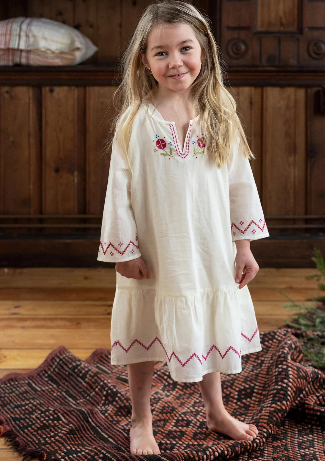 Nachthemd für kleine „Gudrunistas“. Niedliches Modell mit Volant, aus leichtem Baumwollgewebe. Stickereien an Ausschnittschlitz, Ärmelabschlüssen und Saum.S: 98/104, M: 110/116, L: 122/128