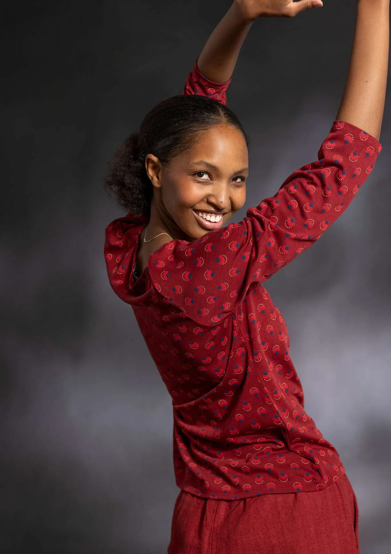 Jerseyshirt mit Musterdruck. Modell mit 3/4-Ärmeln und rundem Ausschnitt. Aus Reststoff gearbeitet.