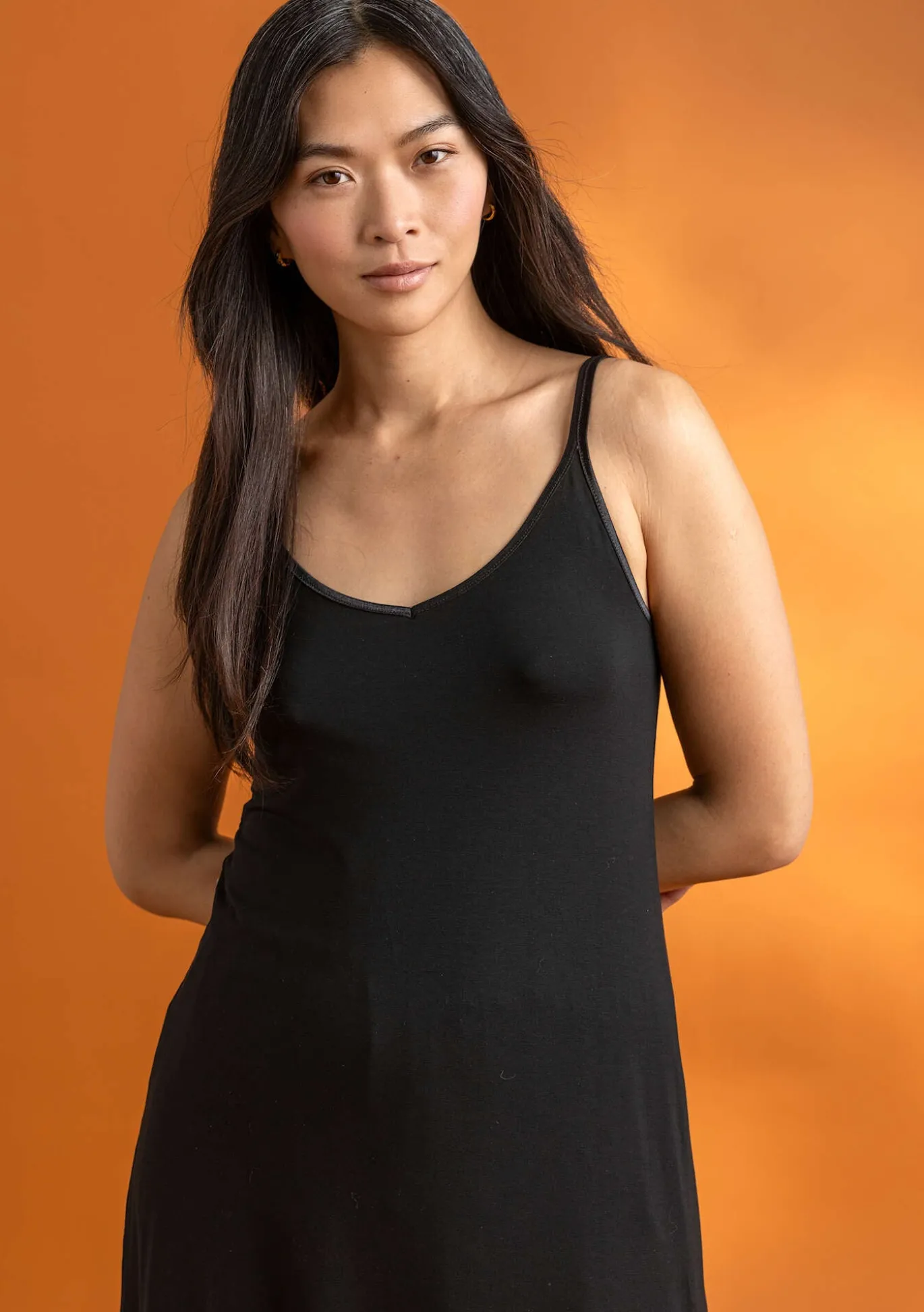 Ärmelloses Kleid aus einer weichen, schmiegsamen Qualität. Hinten leicht abgerundetes Modell mit V-Ausschnitt. Schmale verstellbare Träger. Ideal auch als Unterkleid zu tragen.