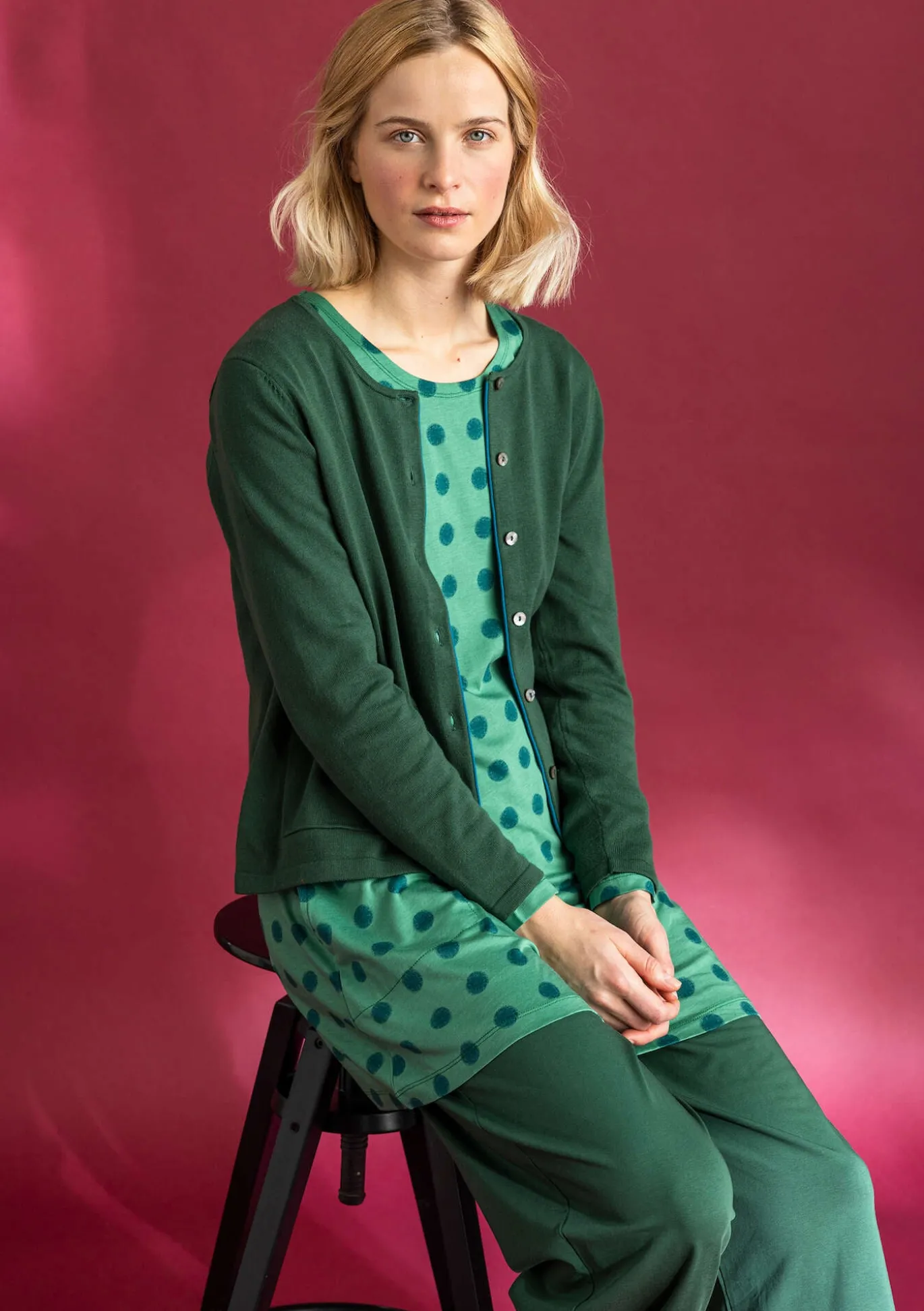 Schlichtes, kombifreudiges Modell mit langen Ärmeln. Hübsch kontrastierende Rollkante vorne und als Akzent auf der Sauminnenseite. Zwei praktische Taschen mit Rippblende am Eingriff. Perlmuttknöpfe.