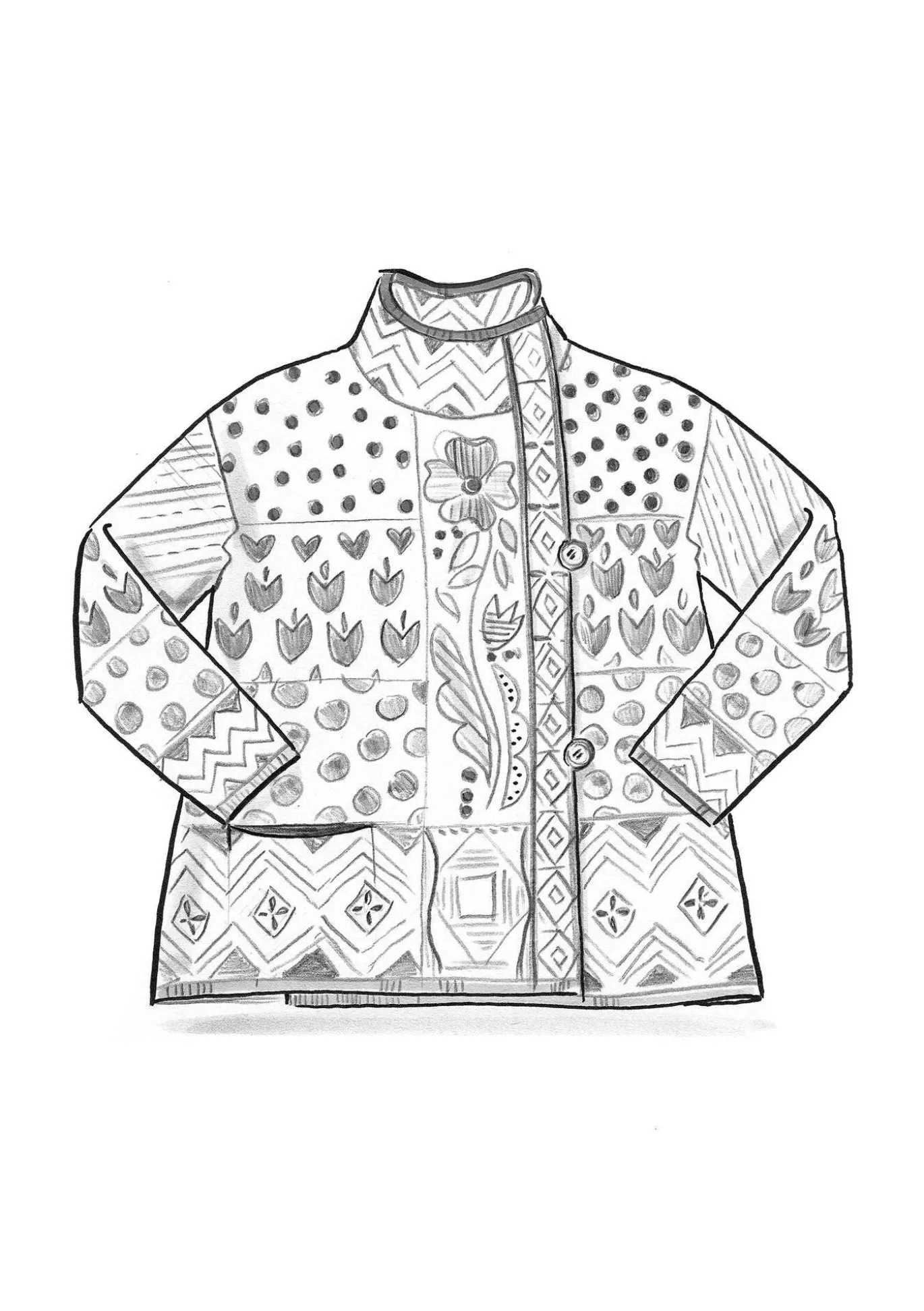 Etwas kürzer geschnittene Jacquardstrickjacke, überlappend gearbeitet und mit zwei Holzknöpfen zu schließen. Herrlich gemustertes Modell mit 3/4-Ärmeln und Stehkragen. Eine eingesetzte Tasche und eine von Hand gestickte Blume auf beiden Seiten.