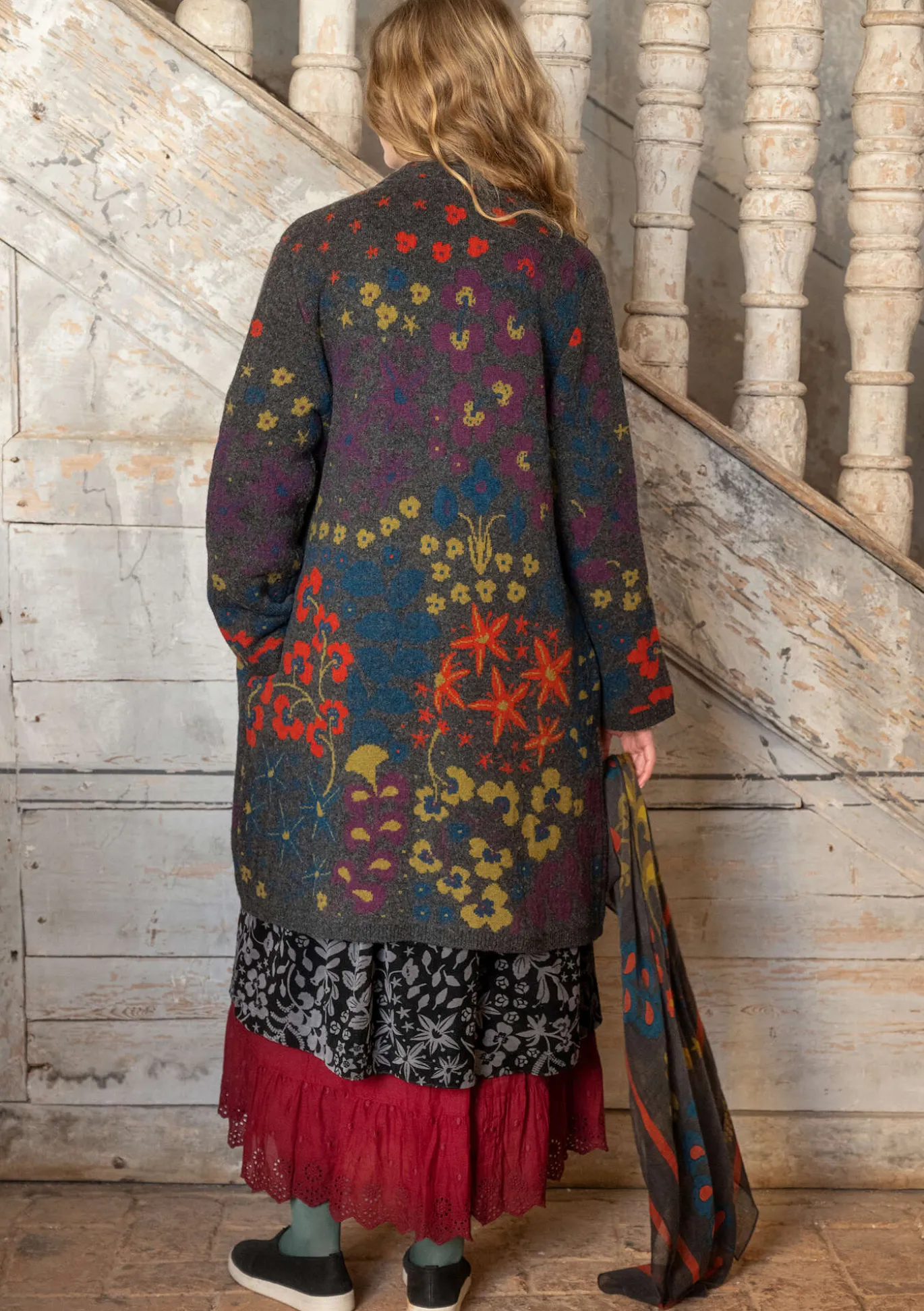 Prächtiger langer Jacquardstrickmantel mit platziertem Musterbild vorne und hinten. Langarmmodell mit etwas höherem Kragen, Seitentaschen und Perlmuttknöpfen.