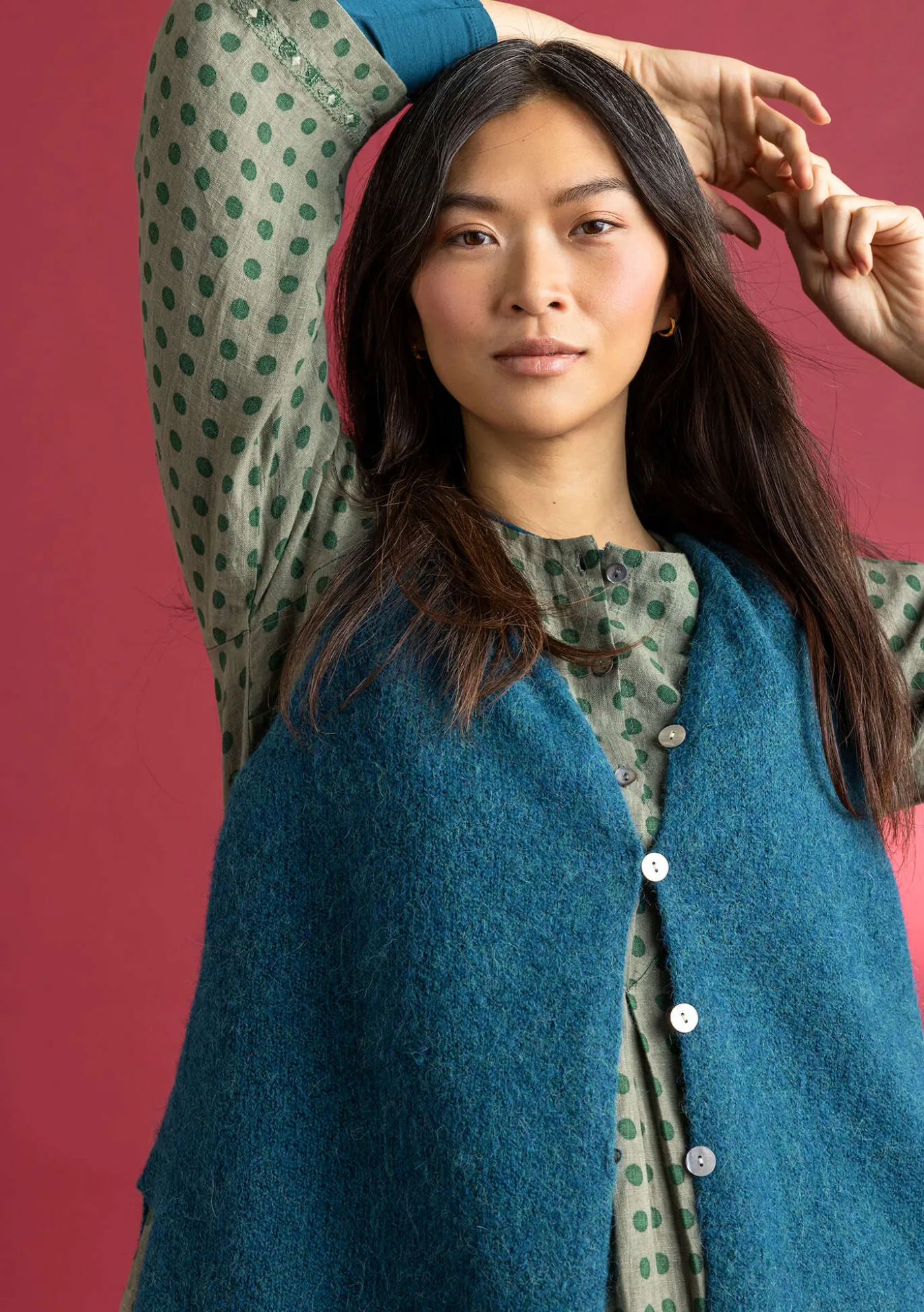 Etwas länger geschnittene Strickweste. Modell aus unserem weichen, flauschigen Melangegarn. Perlmuttknöpfe mit Häkelösen vorne und Schlitze an den Seiten.