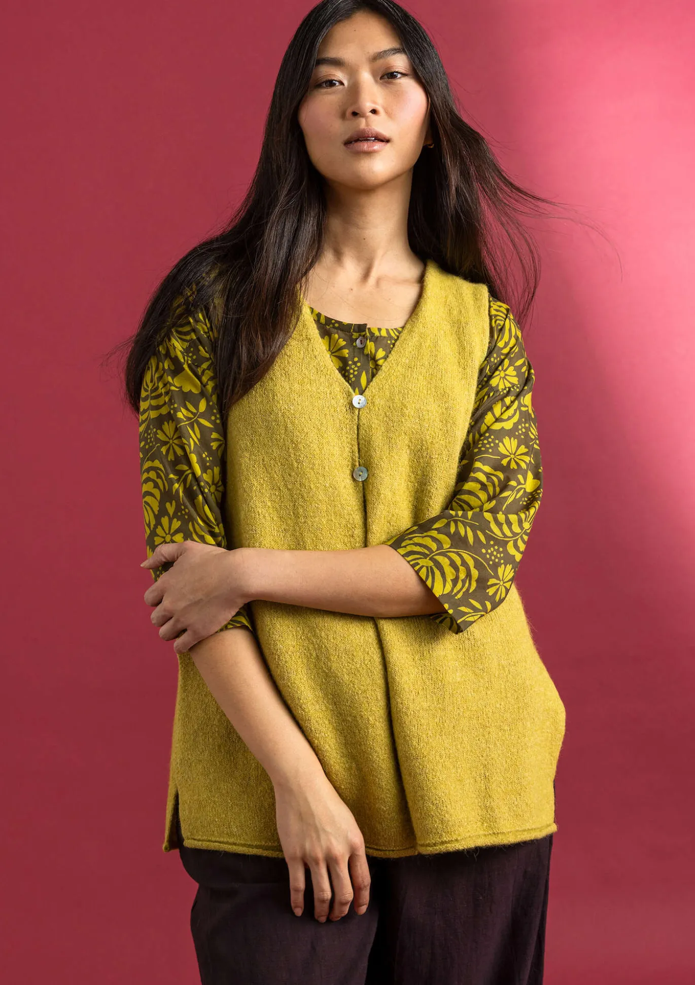 Etwas länger geschnittene Strickweste. Modell aus unserem weichen, flauschigen Melangegarn. Perlmuttknöpfe mit Häkelösen vorne und Schlitze an den Seiten.