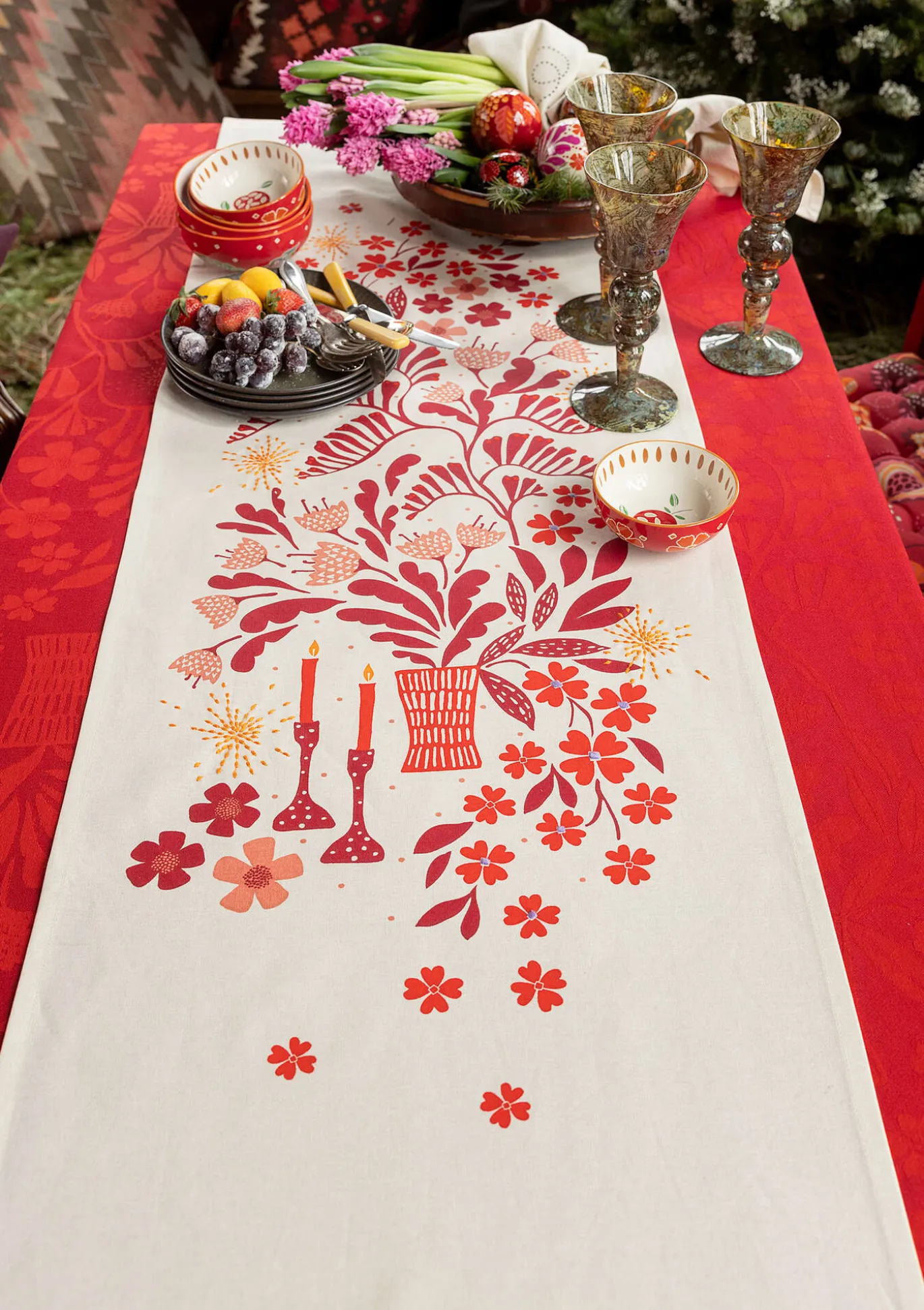 Schöner Tischläufer mit einem Motivprint von üppigen Blumen und Kerzenleuchtern, verziert mit schimmernden Stickdetails. Direkt auf den Tisch gelegt kommt der Läufer ebenso hübsch zur Geltung wie in Kombination mit einer Tischdecke.